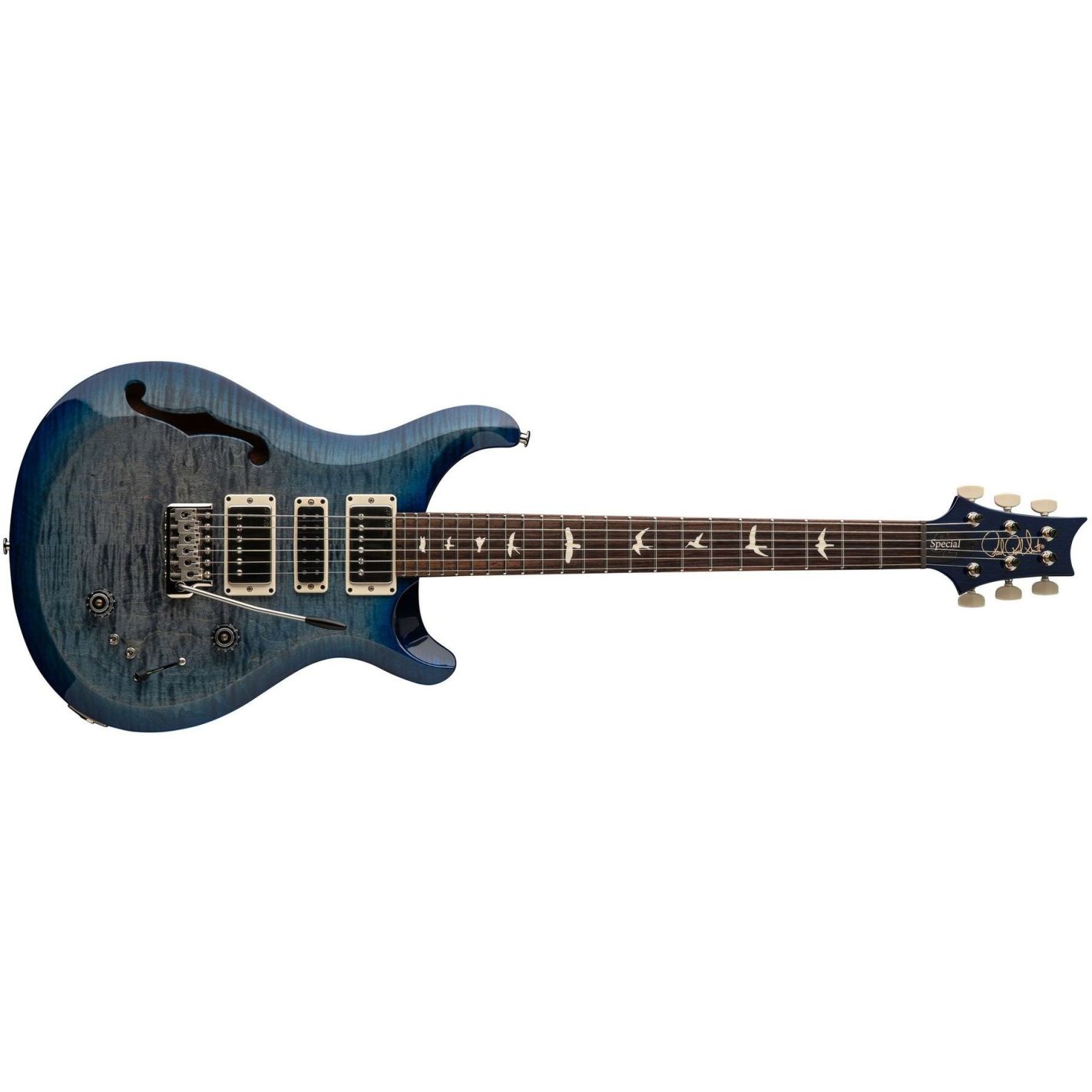 Guitarra eléctrica semi-hollow PRS S2 Special Semi-Hollow Faded Gray Black Blue Burst - Cuerpo semihueco de caoba con tapa de arce tallada y biselado asimétrico, abertura en “f”. Mástil de caoba encolado tipo set con perfil Pattern Regular, 22 trastes y escala de 25" (635 mm). Diapasón de palisandro con incrustaciones Old School Birds. Configuración de pastillas H–S–H con humbuckers PRS 58/15 LT en posiciones de mástil y puente, y Narrowfield DD en posición central. Selector de 5 posiciones con dos mini conmutadores para división de bobina, ofreciendo hasta doce combinaciones tonales