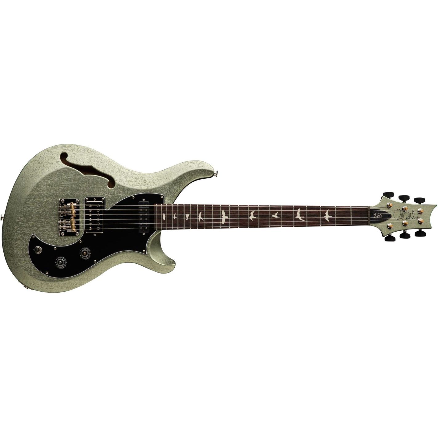 Guitarra eléctrica semi-hollow PRS S2 Vela Satin Mavis Mint Metallic - Cuerpo de caoba semi-hollow con F-hole y tallado asimétrico, acabado satinado en nitro. Mástil de caoba encolado con construcción scarfed y perfil Pattern Regular. Diapasón de palorrosa con radio de 10", incrustaciones Birds y 22 trastes, escala de 25" (635 mm). Cejuela PRS de 42,1 mm. Pastillas PRS DS-01 en puente y Narrowfield en mástil, conmutadas mediante selector de 3 posiciones y controles de volumen y tono push/pull. Puente PRS Plate Style. Clavijeros PRS Phase III no bloqueantes con botones tipo ala. Hardware niquelado. Incluye funda Premium Gig Bag.