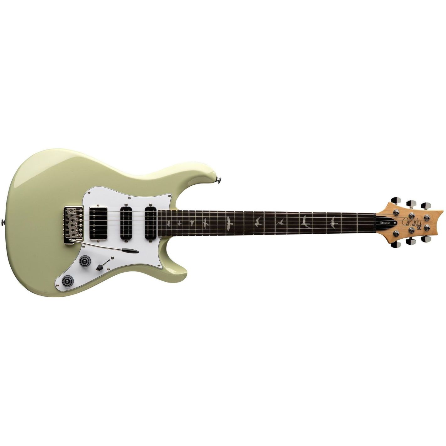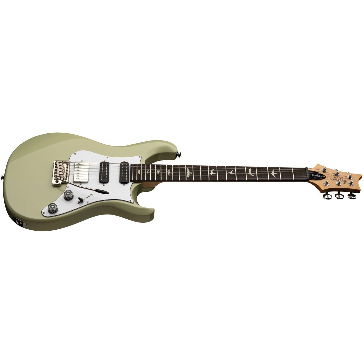 Guitarra eléctrica PRS Guitars SE Studio Standard, Sage Green - Cuerpo de caoba maciza con diseño double cut y golpeador vintage. Mástil atornillado de arce tipo Wide Thin, escala de 25" y 22 trastes. Diapasón de palosanto con incrustaciones Birds. Configuración de pastillas H-S-S: humbucker 58/15 S en puente y dos Narrowfield DD S en posiciones central y mástil. Controles de volumen y tono con push/pull, selector de 5 posiciones. Puente PRS Patented Tremolo y clavijeros PRS Designed Tuners. Funda acolchada incluida. Acabado Sage Green.