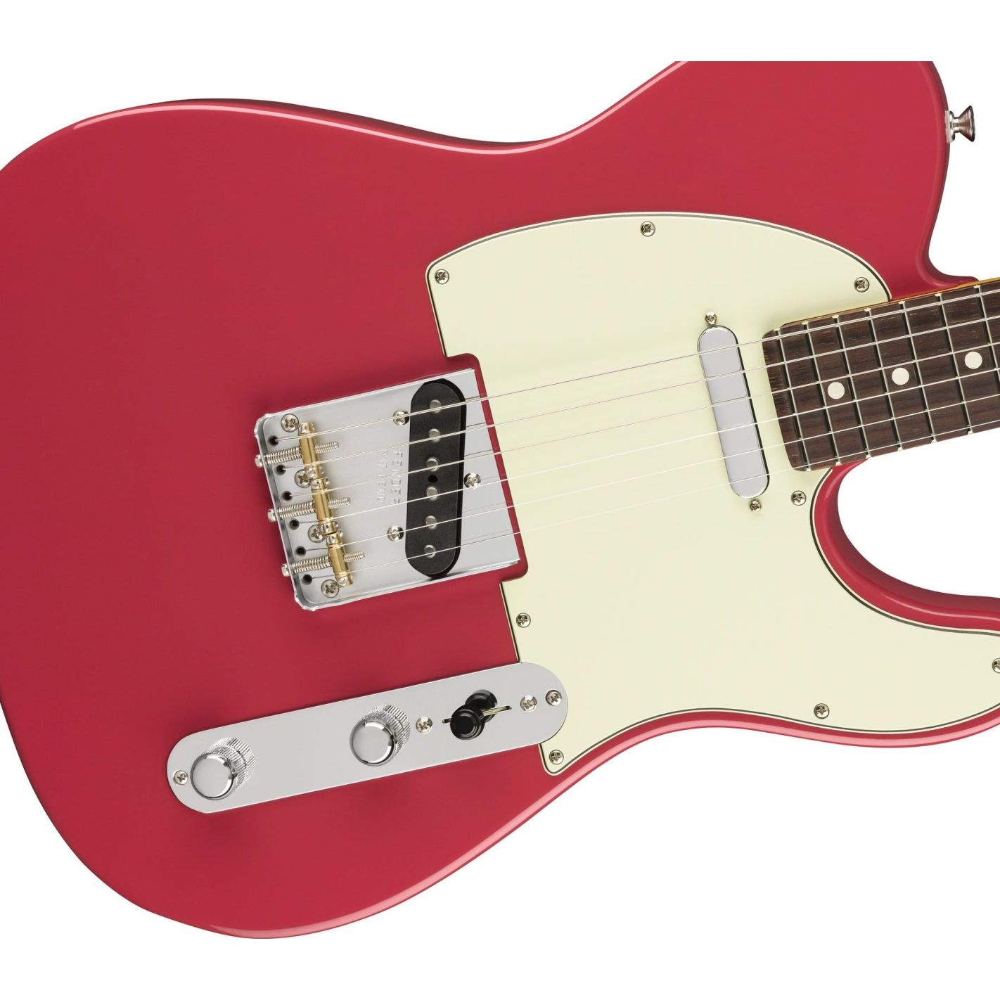 Guitarra eléctrica Fender American Professional Classic Telecaster Rosewood Fingerboard Faded Dakota Red - Cuerpo de aliso con acabado Gloss Urethane y forma Telecaster. Mástil de arce Modern "C" con acabado satinado, diapasón de palorrosa de 9.5" (241 mm) con 22 trastes medium jumbo e incrustaciones "dot" blancas. Escala de 25.5" (648 mm), cejuela de hueso sintético de 42.8 mm. Pastillas Coastline ’63 Telecaster (puente / mástil), configuración SS. Controles Master Volume y Master Tone. Selector de 3 posiciones. Puente Tele vintage de 3 selletas de latón ranurado con cuerdas a través del cuerpo. Clavijeros Fender ClassicGear Staggered. Golpeador mint green de 3 capas. Hardware niquelado/cromado. Incluye funda Deluxe Gig Bag.