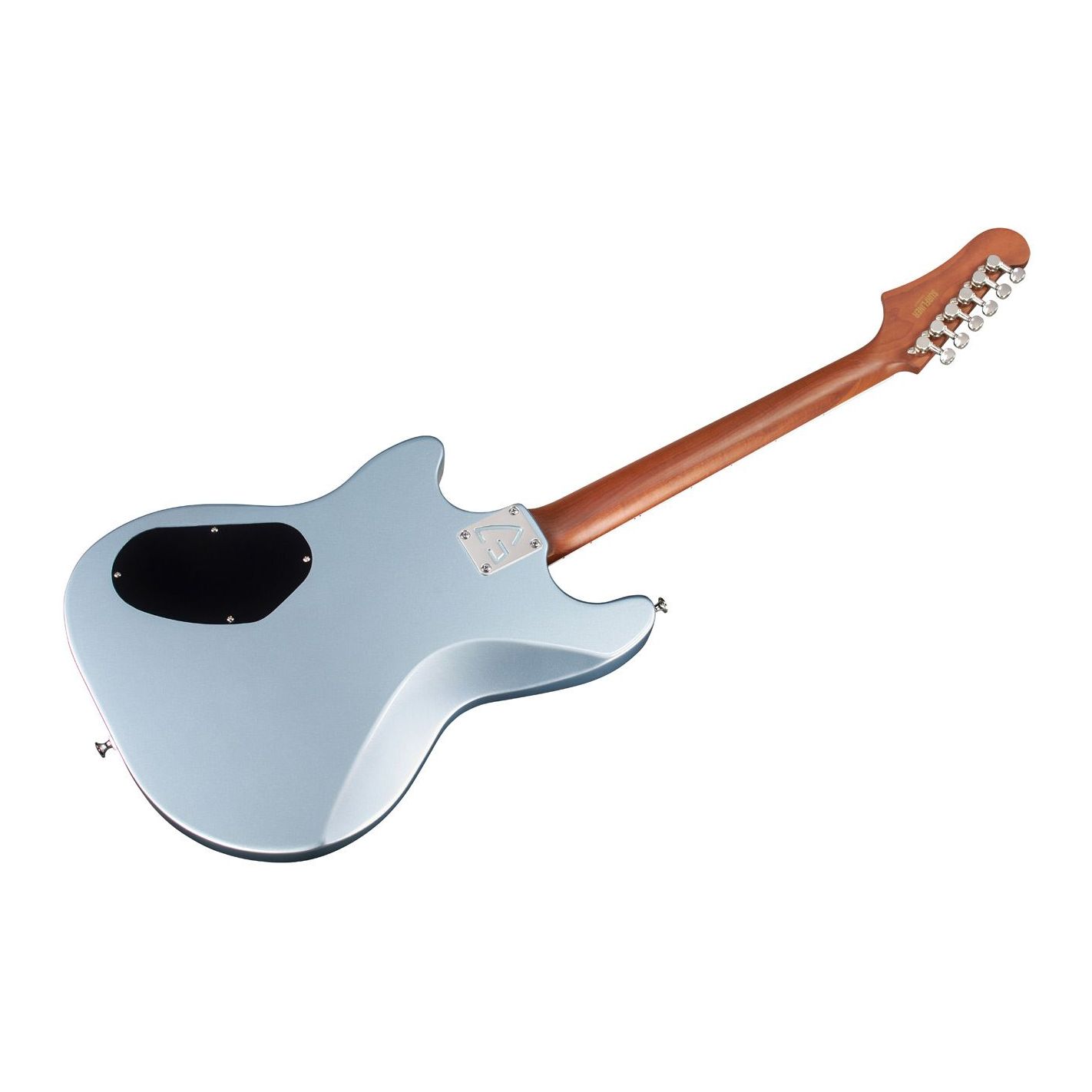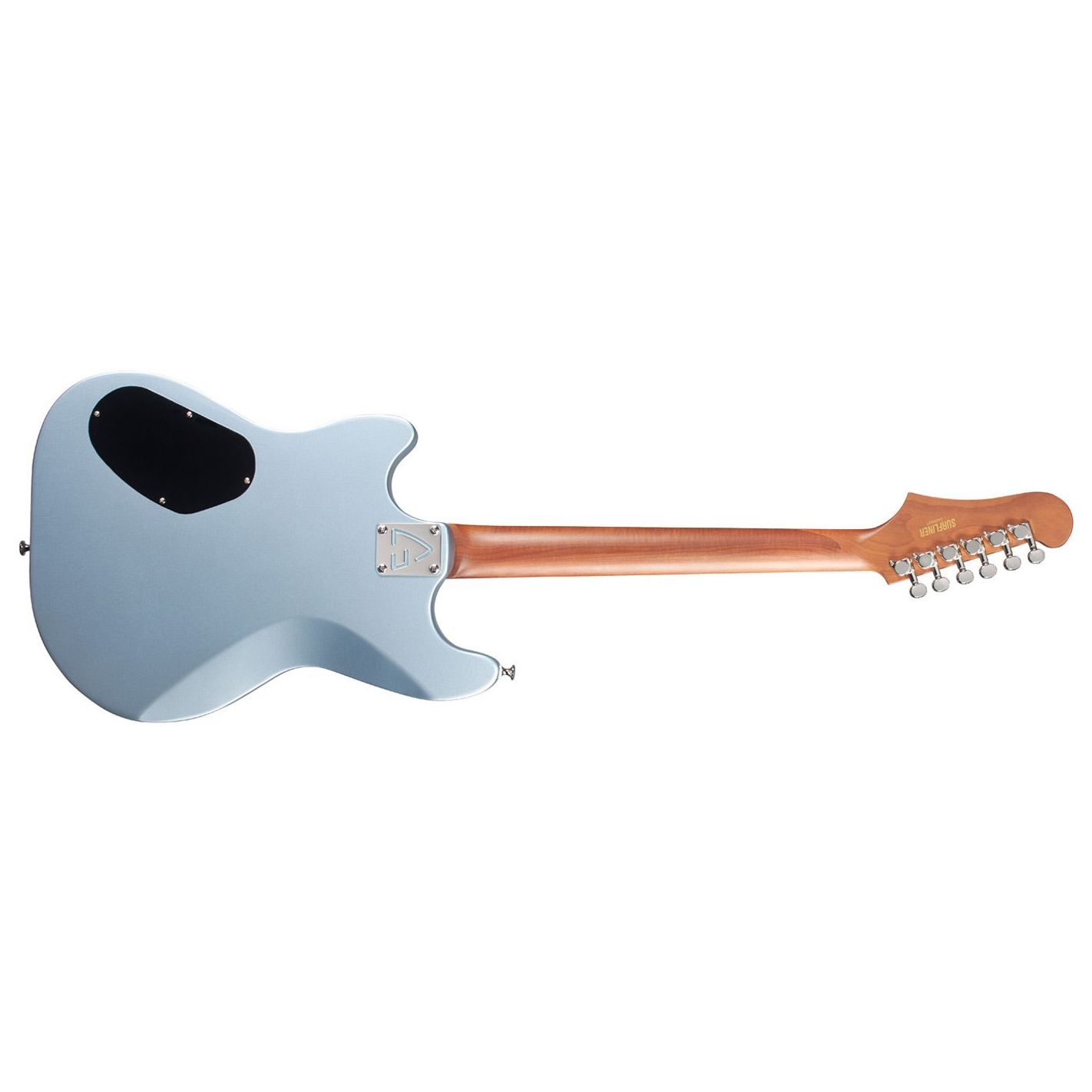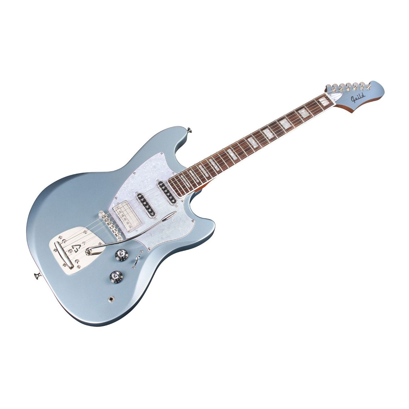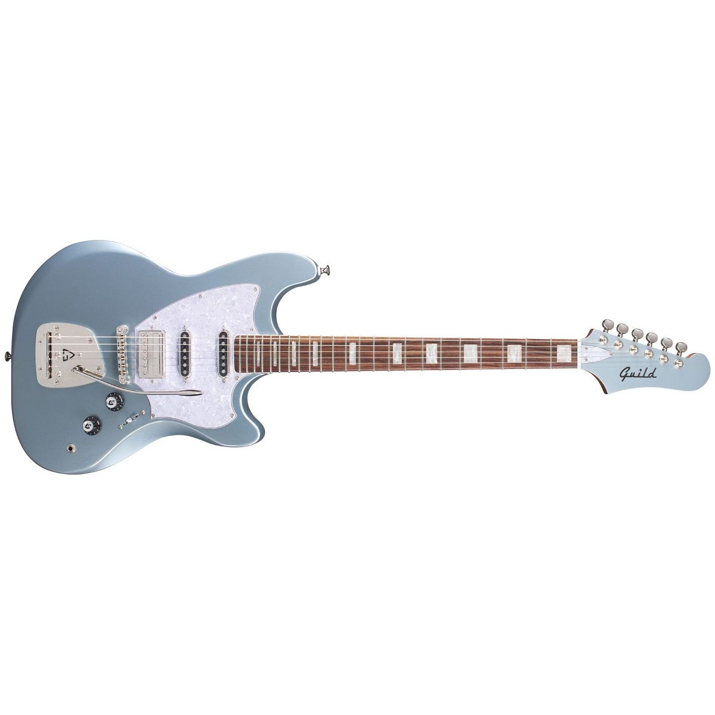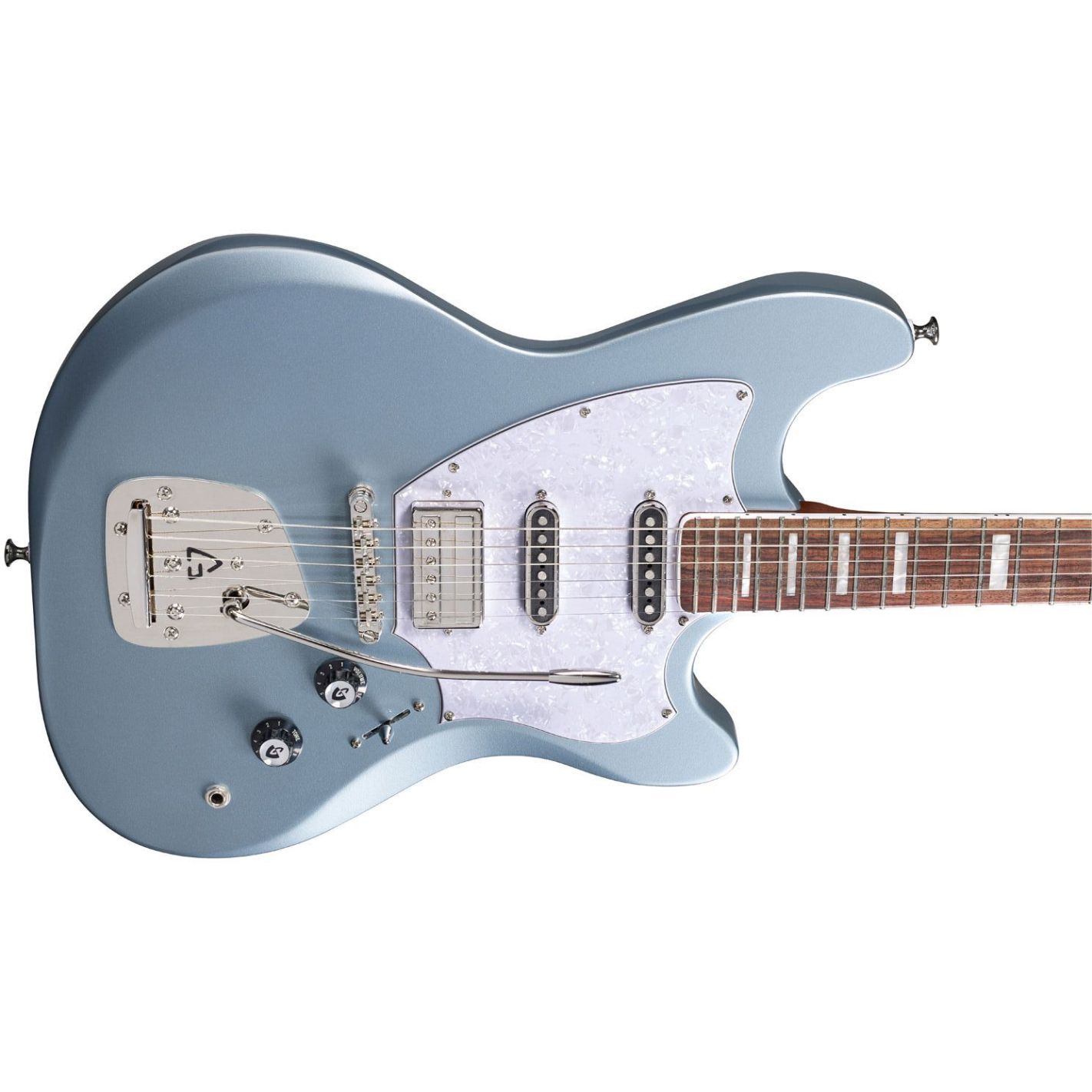 Guitarra eléctrica Guild Surfliner Deluxe Glacier Blue Metallic - Cuerpo sólido de álamo con diseño offset. Mástil atornillado de arce tostado con perfil en “C” satinado, escala de 25.5" y diapasón de palisandro con binding e incrustaciones tipo bloque. Configuración HSS con humbucker Guild HB-2 en el puente (imán Alnico II) y dos single-coil DeArmond Aerosonic en mástil y medio. Selector de 5 posiciones. Puente vibrato Guild Floating Vibrato Tailpiece (GFVT) con logo “G” en relieve y ajuste de tensión. Herrajes niquelados.