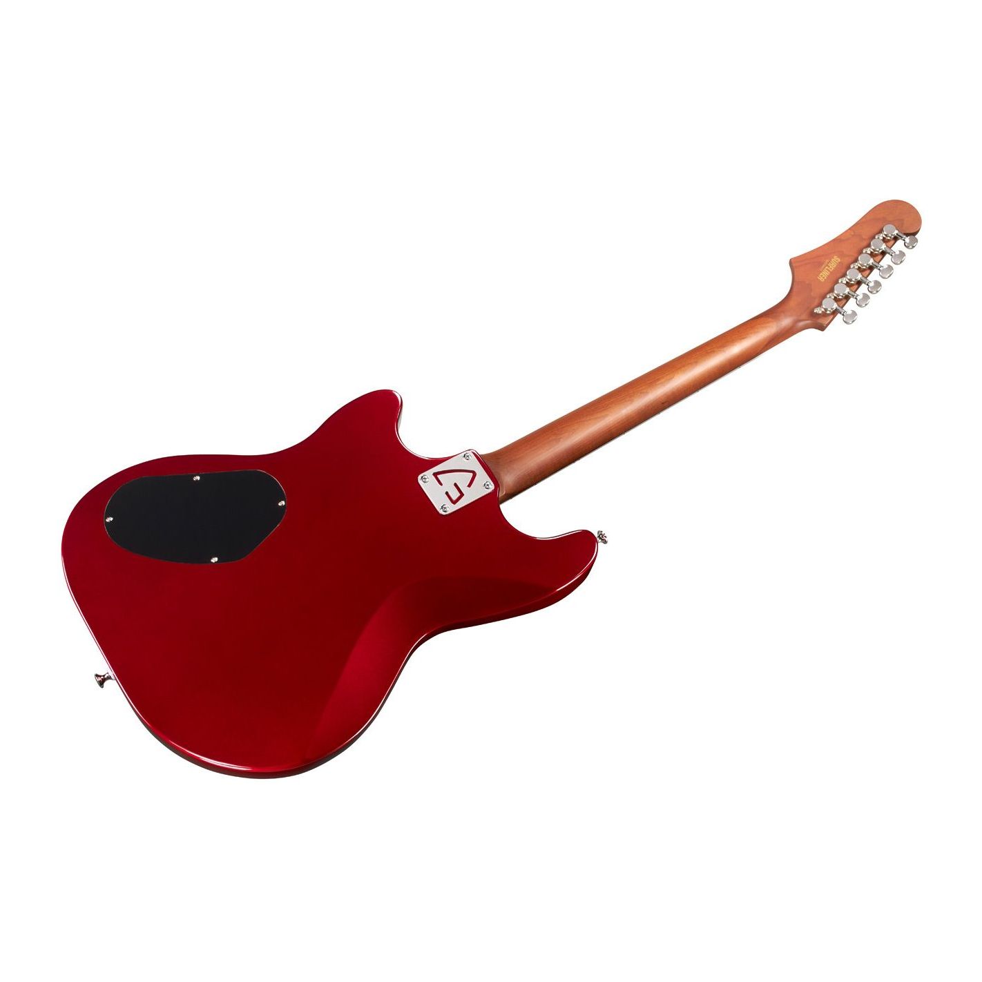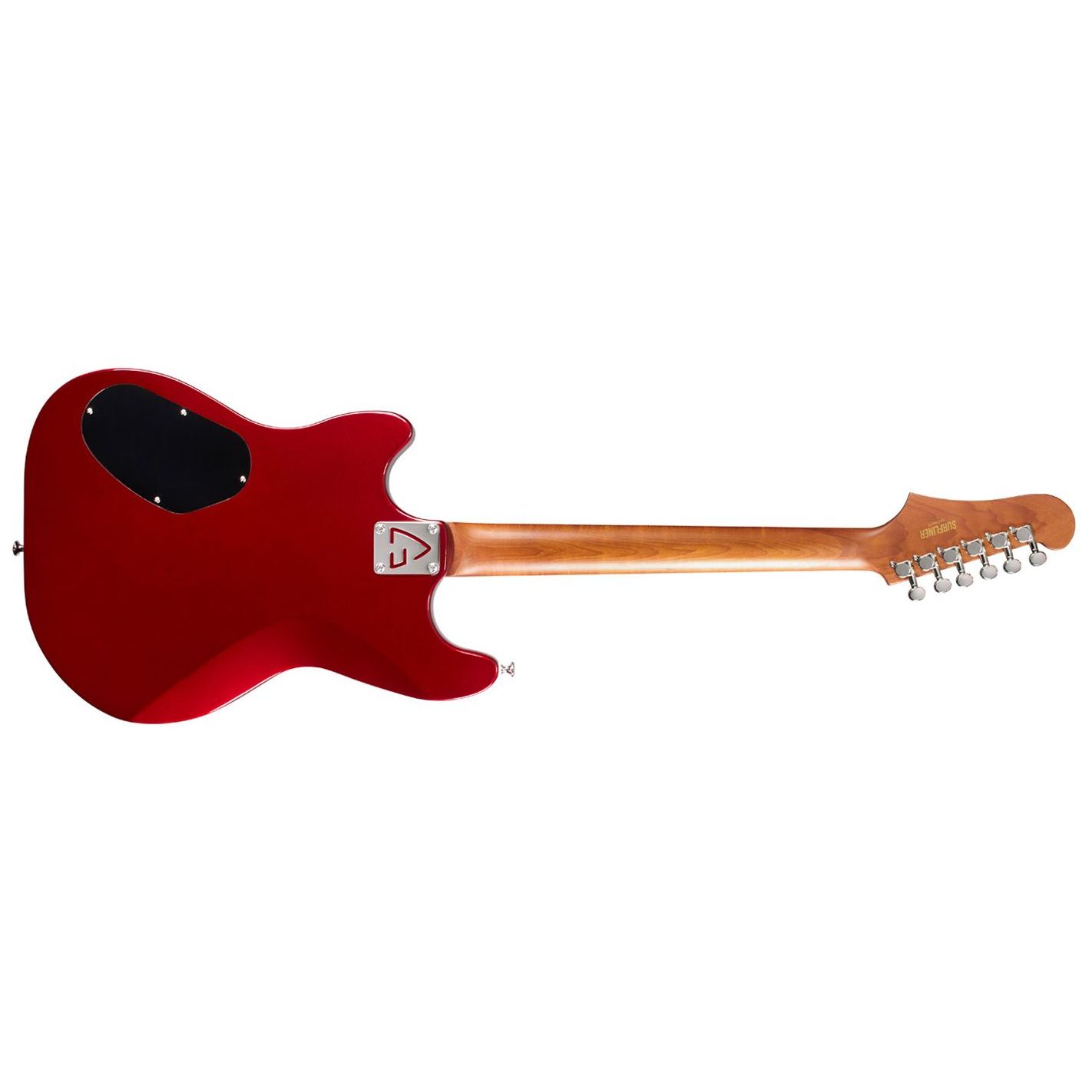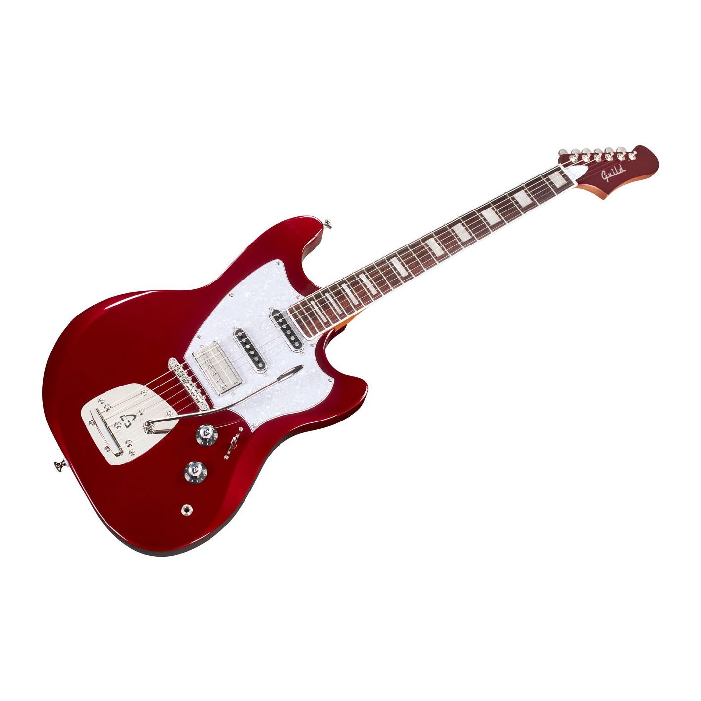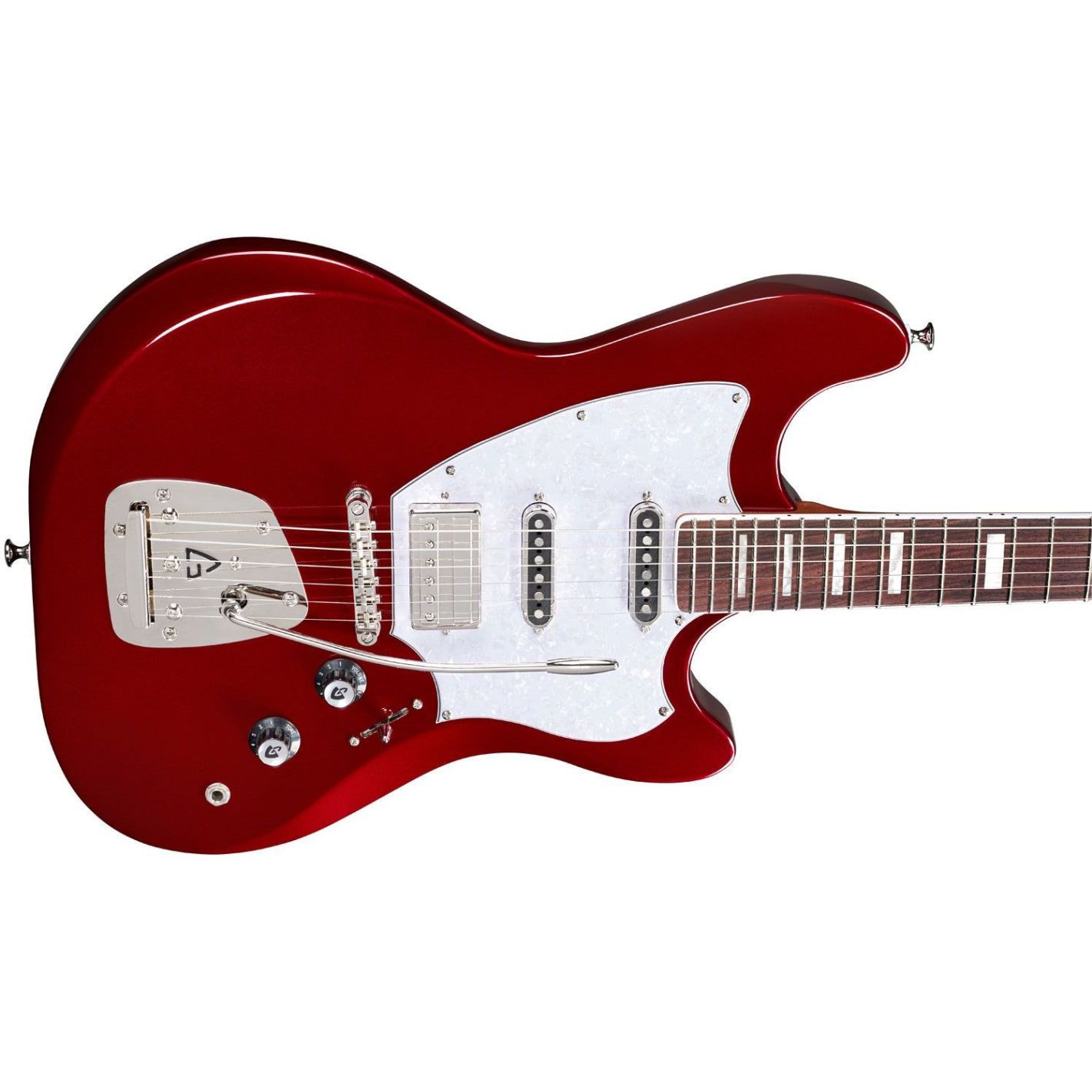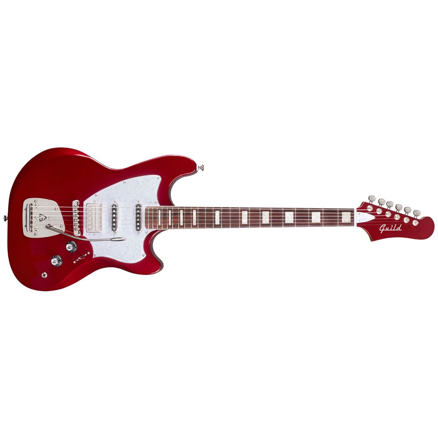 Guitarra eléctrica Guild Surfliner Deluxe Scarlett Red Metallic - Cuerpo sólido de álamo con diseño offset. Mástil atornillado de arce tostado con perfil en “C” satinado, escala de 25.5" y diapasón de palisandro con binding e incrustaciones tipo bloque. Configuración HSS con humbucker Guild HB-2 en el puente (imán Alnico II) y dos single-coil DeArmond Aerosonic en mástil y medio. Selector de 5 posiciones. Puente vibrato Guild Floating Vibrato Tailpiece (GFVT) con logo “G” en relieve y ajuste de tensión. Herrajes niquelados.