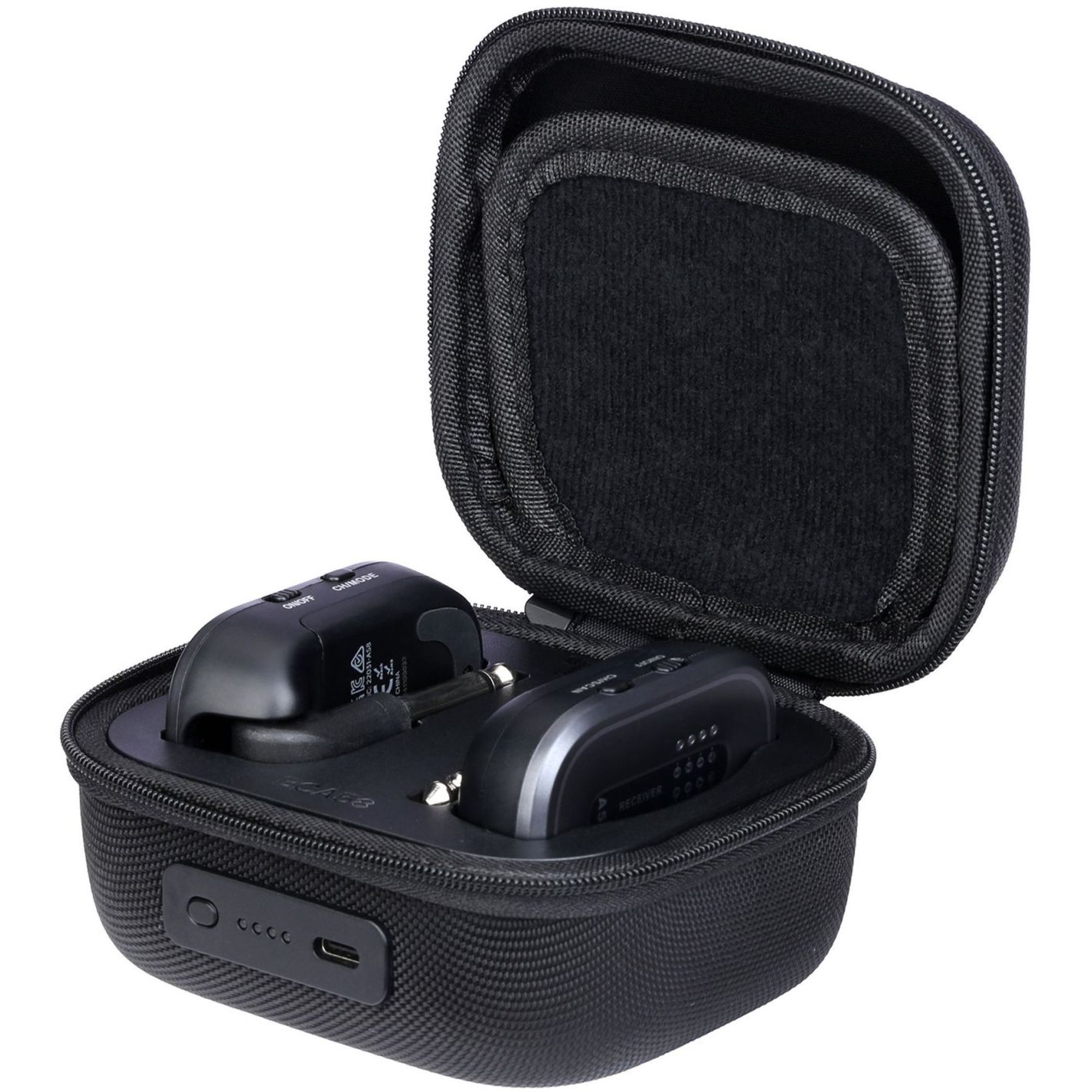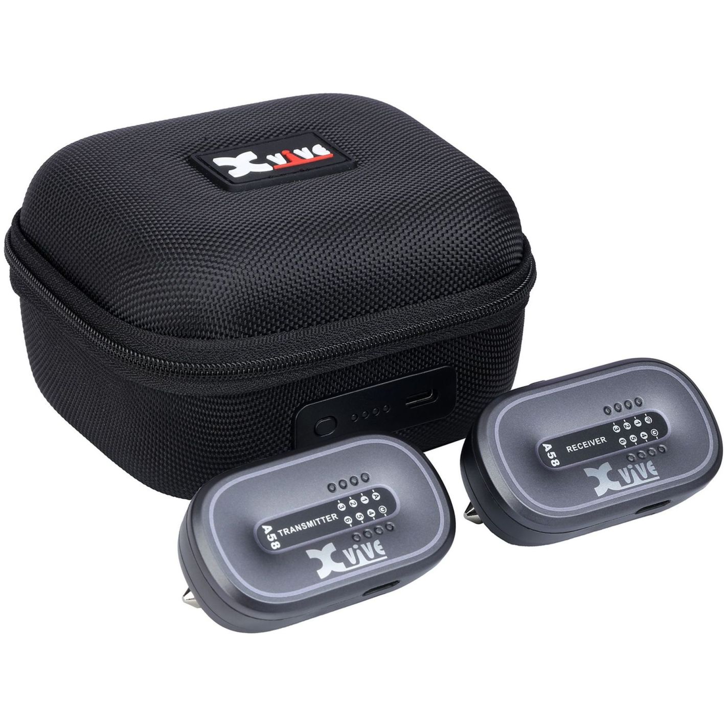 Sistema wireless guitarra y bajo Xvive AC58 - Sistema inalámbrico A58 con estuche de carga BCA58, True Diversity 5.8 GHz, audio 24 bits/48 kHz, 6 canales, alcance hasta 30 m, latencia <5 ms, autonomía hasta 5 h, compatible con instrumentos activos y pasivos jack 6.35 mm, estuche con batería de 5000 mAh recargable por USB-C, acabado negro.