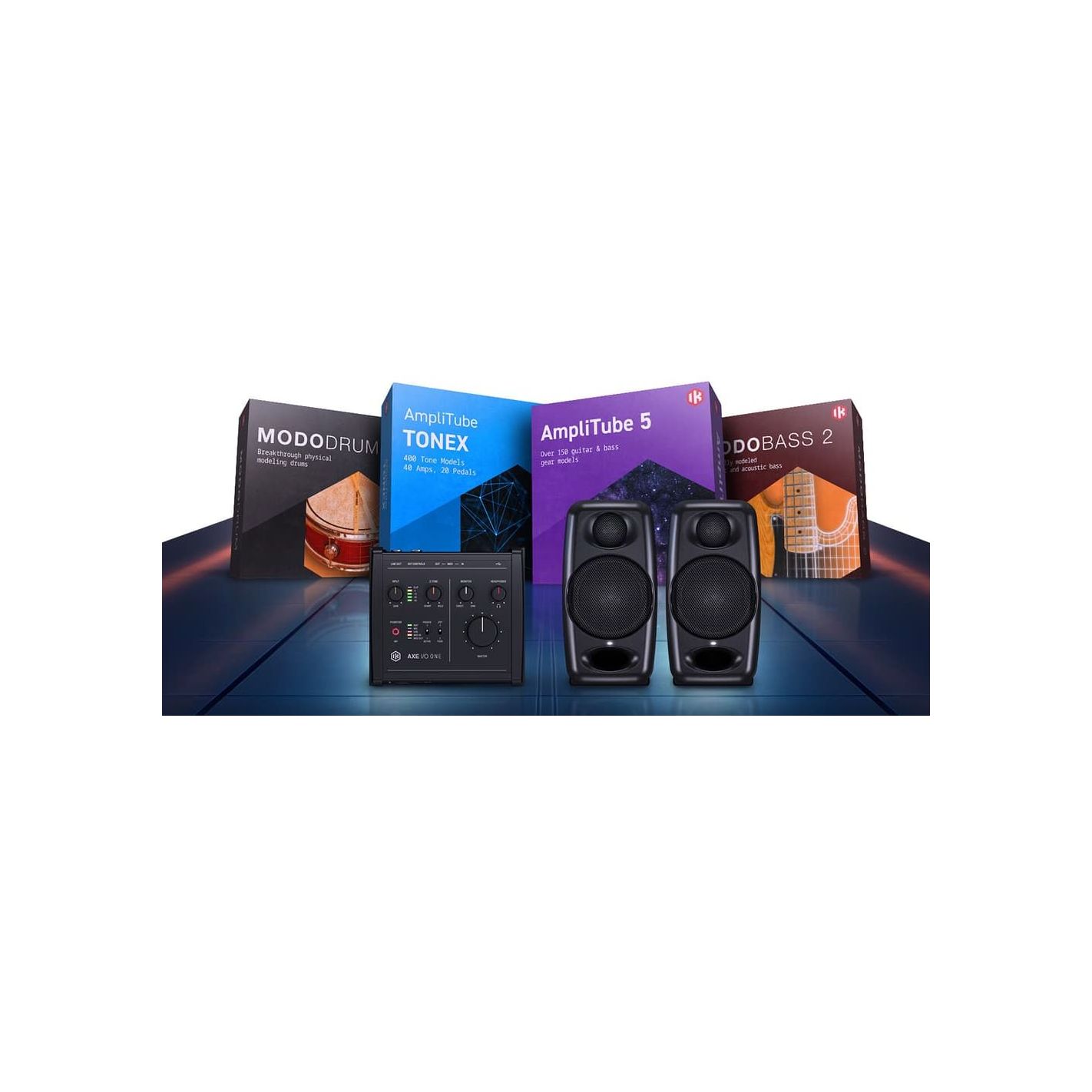 Bundle estudio portátil para guitarra, Ikmultimedia CB-PGSB-HCD-IN - Incluye monitores activos iLoud Micro Monitor con respuesta precisa, interfaz Axe I/O One con control Z-Tone, entrada JFET y salida dedicada, software AmpliTube 5 con más de 180 modelos e integración con Tonex y ToneNET, software Tonex con modelado AI de amplis, pedales y cabinas, 400 tonos premium y creación ilimitada, Modo Drum 1.5 con 13 kits personalizables y Modo Bass 2 con 22 modelos de bajo ajustables.