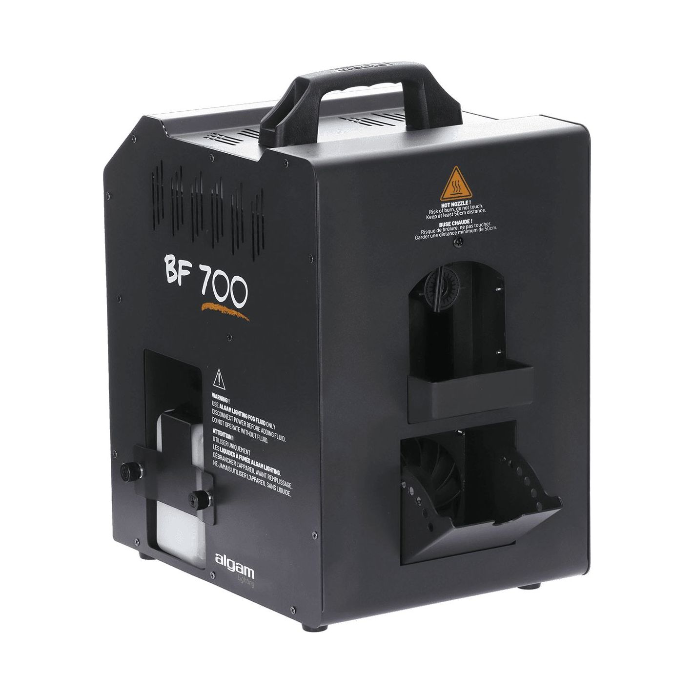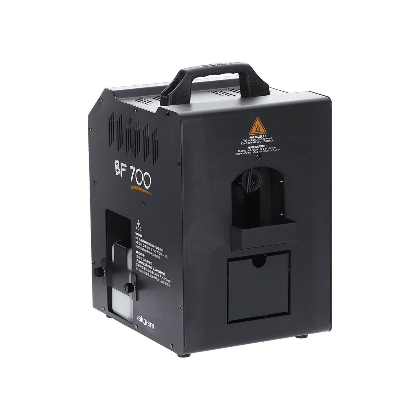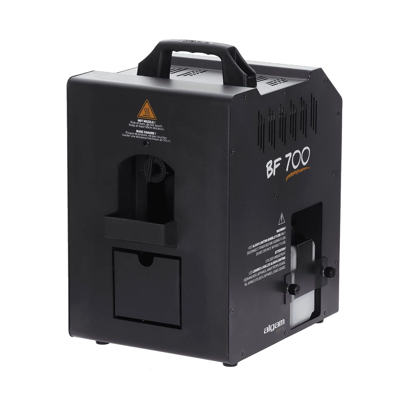 Máquina de burbujas y humo, Algamlight BF700 - Unidad combinada para emisión de burbujas y humo con potencia máxima de 700 W. Tiempo de calentamiento de 2 a 3 minutos y autonomía aproximada de 15 min en uso continuo. Equipada con dos depósitos de 0,5 L (uno para líquido de burbujas y otro para humo). Modos seleccionables: burbujas, humo o burbujas + humo. Panel de control con indicadores LED de precalentamiento y máquina lista, más botones de selección de modo. Incluye mando a distancia inalámbrico. Compatible con líquidos para burbujas Algam Lighting Bub-st-1L/Bub-st-5L y líquidos para humo