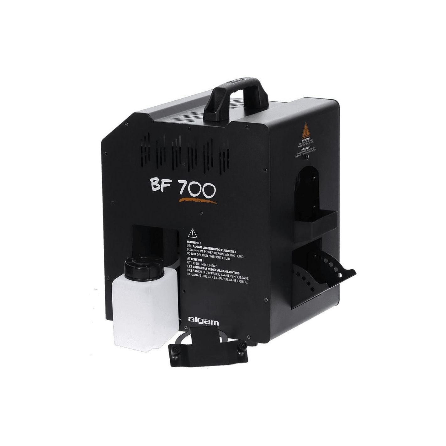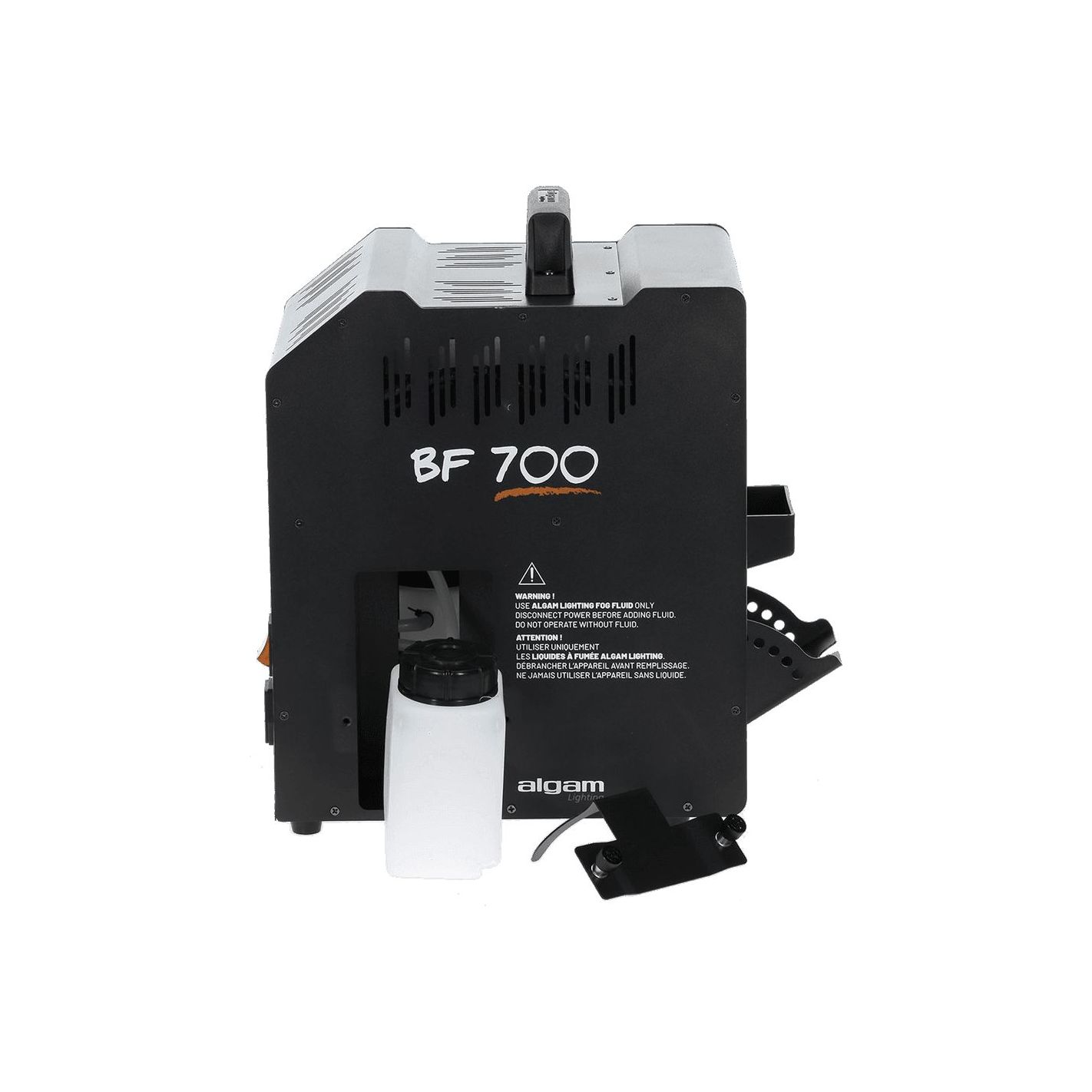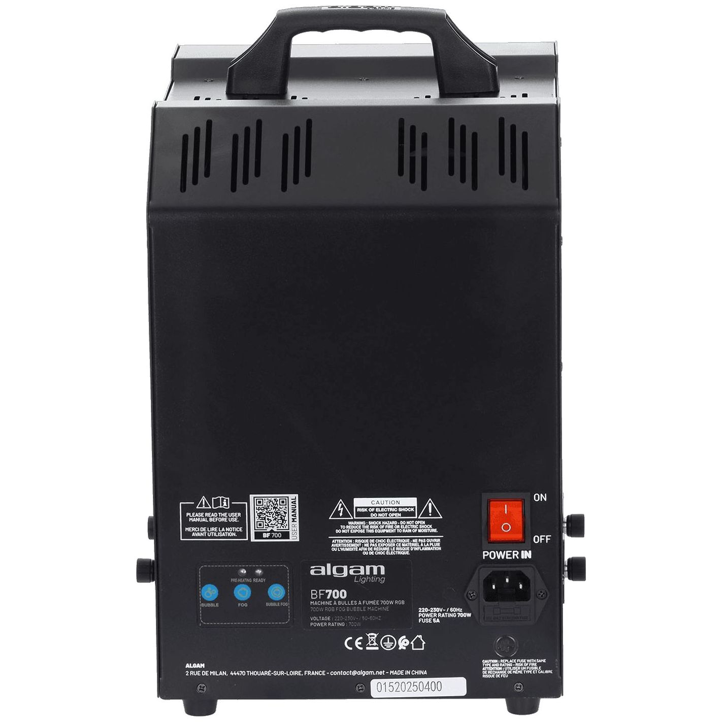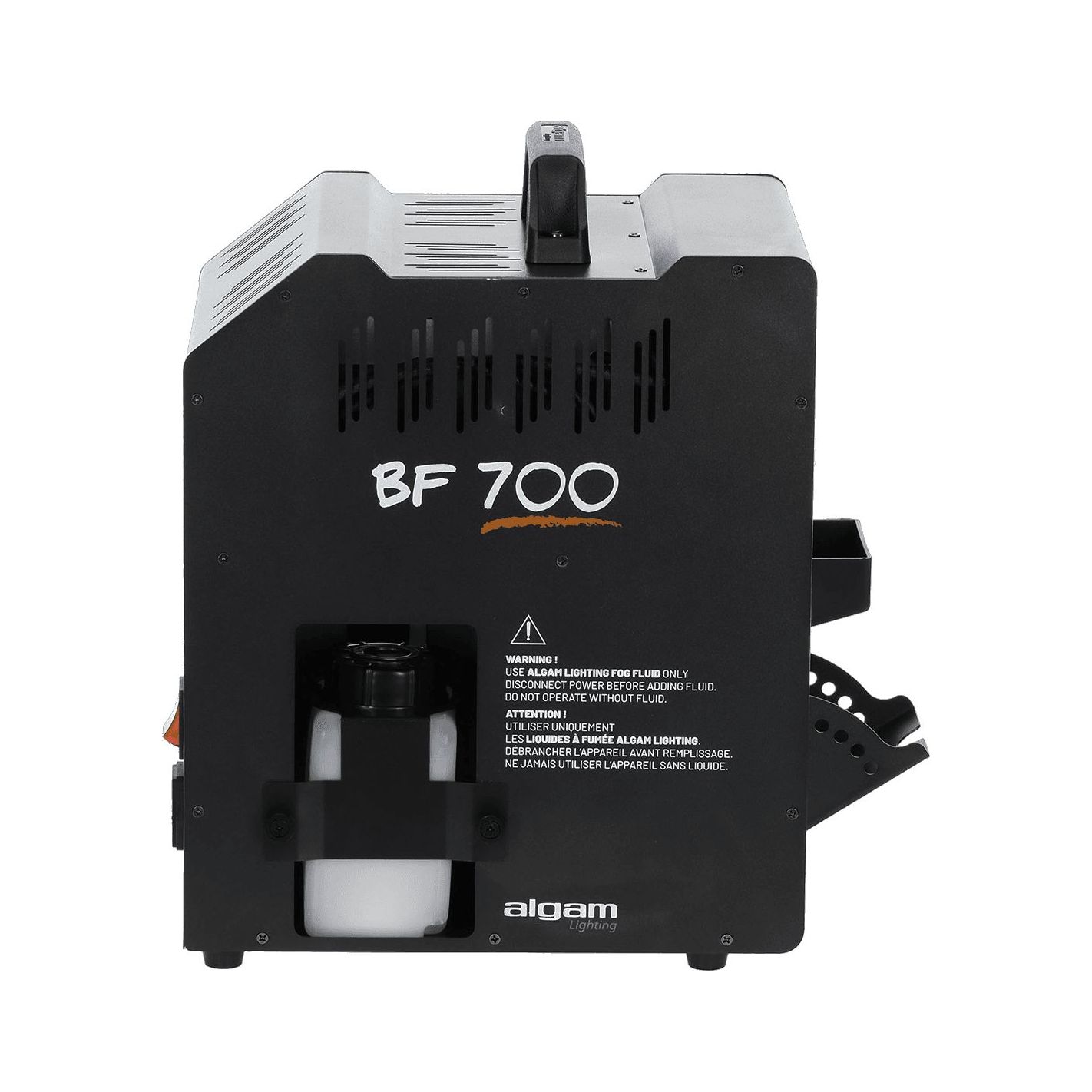 Máquina de burbujas y humo, Algamlight BF700 - Unidad combinada para emisión de burbujas y humo con potencia máxima de 700 W. Tiempo de calentamiento de 2 a 3 minutos y autonomía aproximada de 15 min en uso continuo. Equipada con dos depósitos de 0,5 L (uno para líquido de burbujas y otro para humo). Modos seleccionables: burbujas, humo o burbujas + humo. Panel de control con indicadores LED de precalentamiento y máquina lista, más botones de selección de modo. Incluye mando a distancia inalámbrico. Compatible con líquidos para burbujas Algam Lighting Bub-st-1L/Bub-st-5L y líquidos para humo