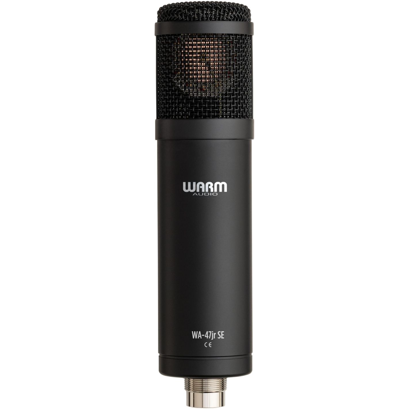 Micrófono de condensador Warm Audio WA-47jr SE Negro - Serie Studio Essential, versión reducida del WA-47jr con cápsula de diafragma grande K-47 (placa posterior simple), sin transformador FET. Patrón polar cardioide fijo. Ruta de señal completamente discreta con agudos suaves, medios ricos, graves potentes y nivel de ruido ultrabajo. Adecuado para voces, instrumentos acústicos, baterías, pianos, streaming y podcasts. Incluye soporte de micrófono rígido y funda de cuero de primera calidad.