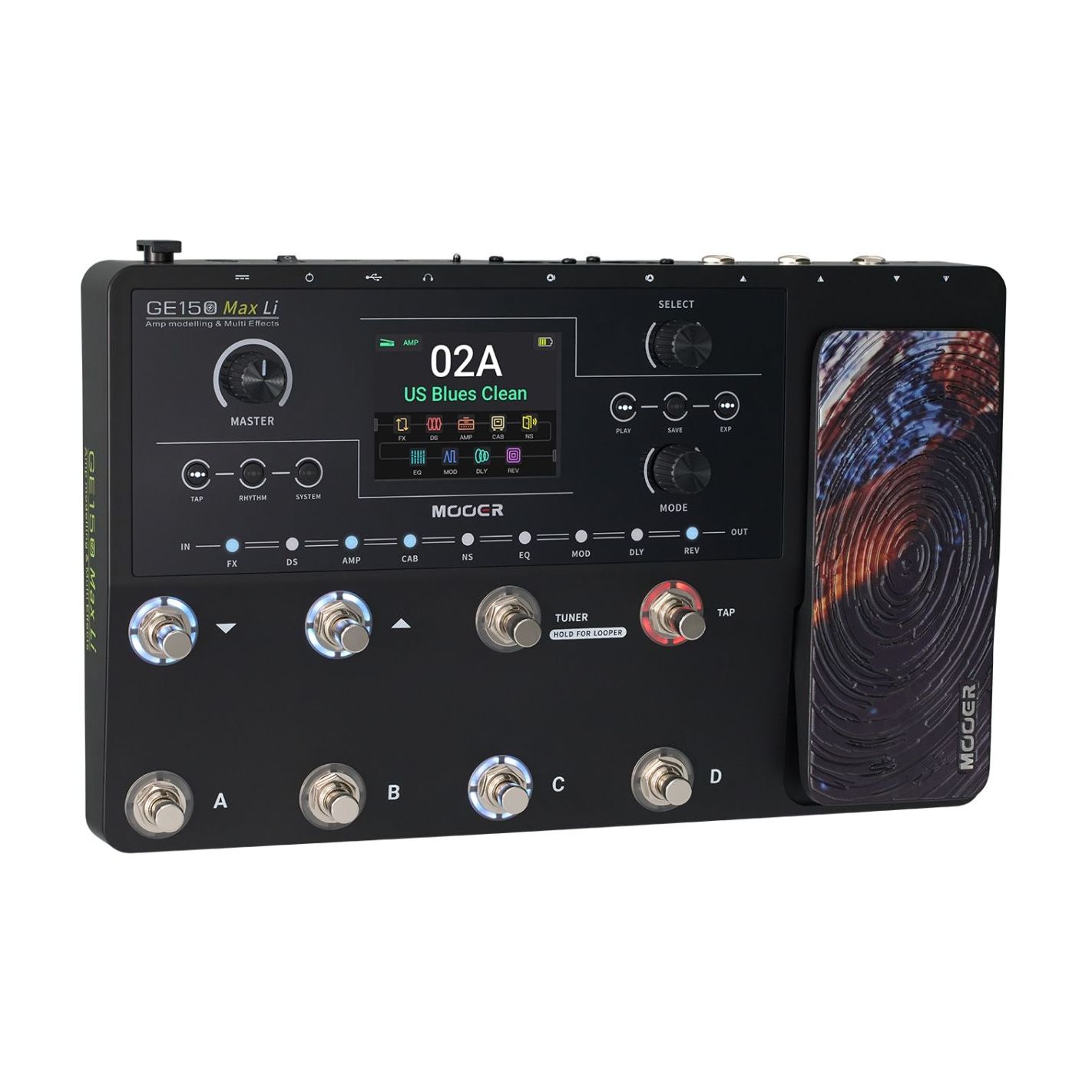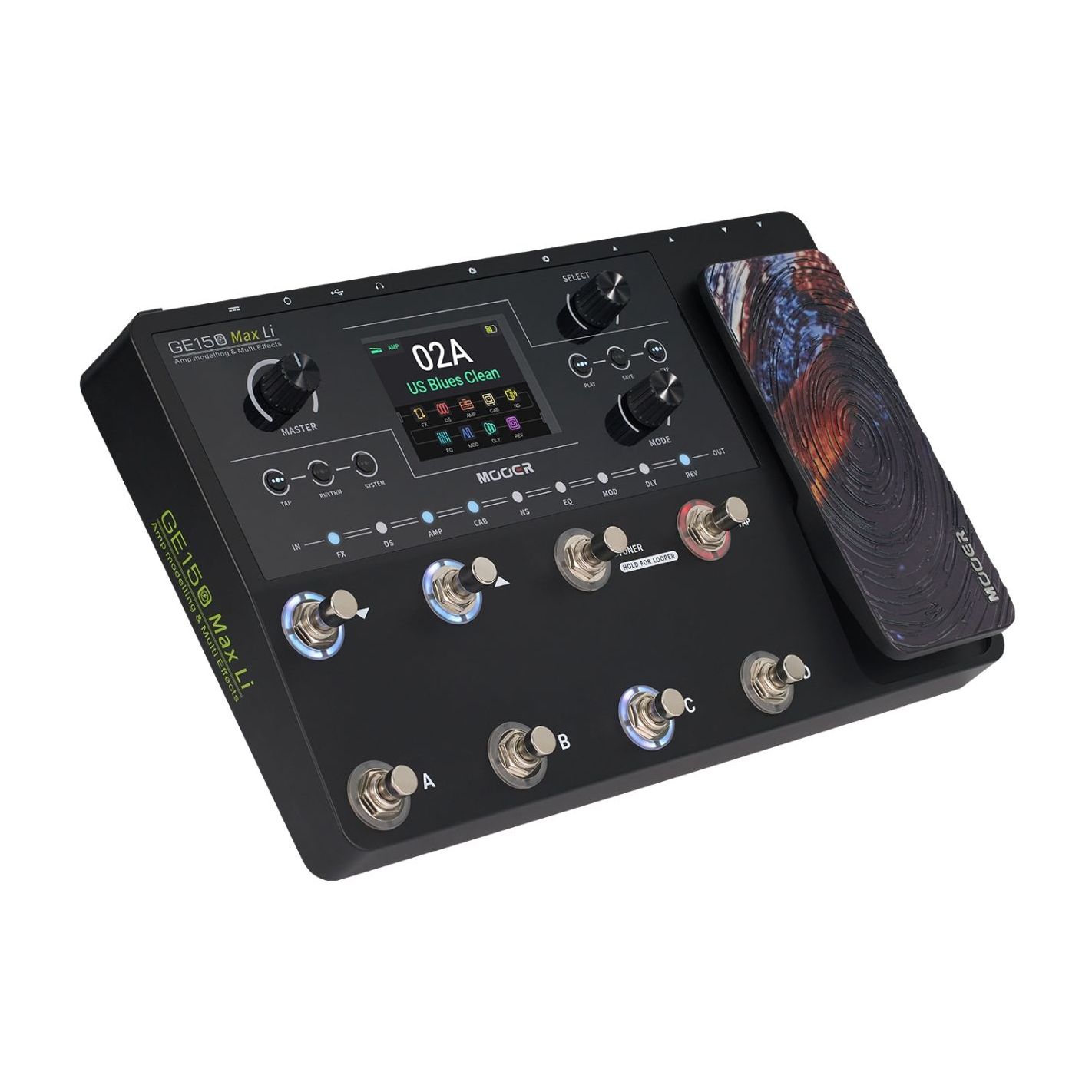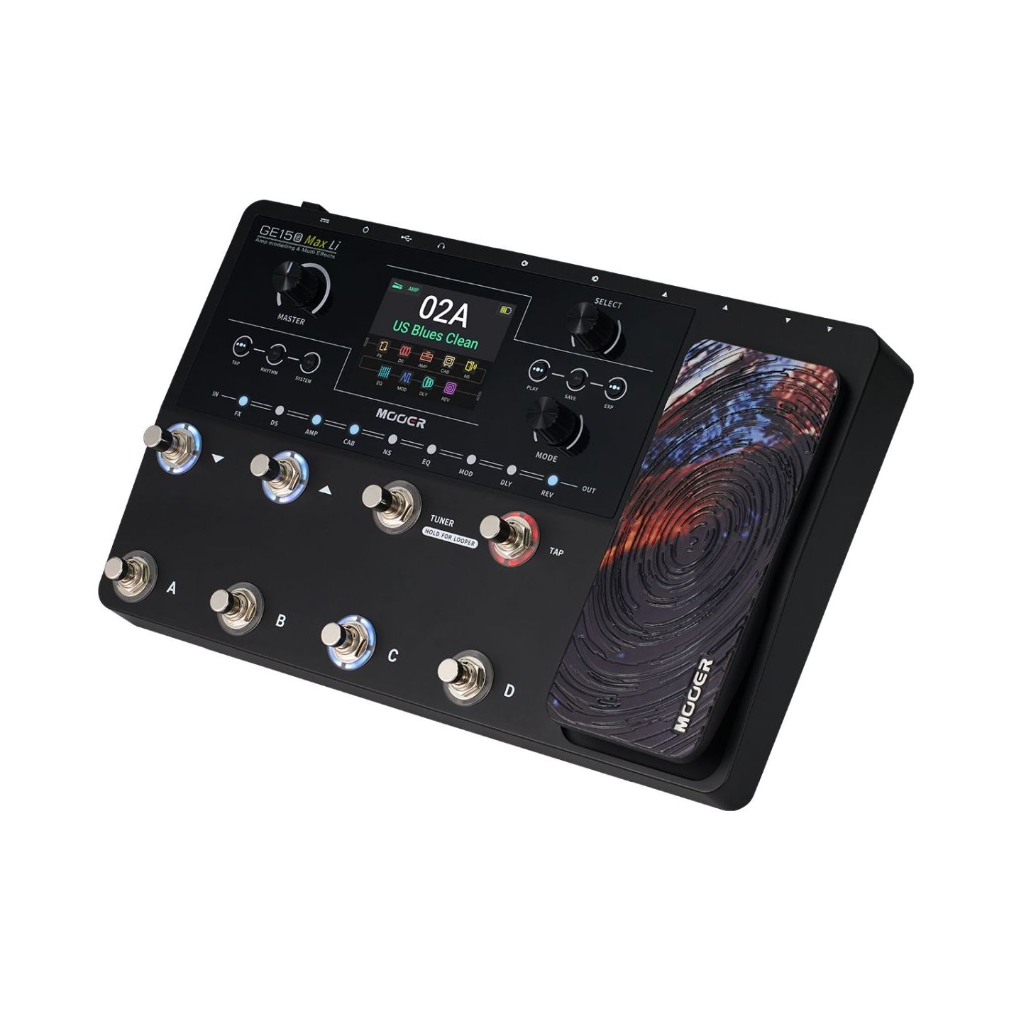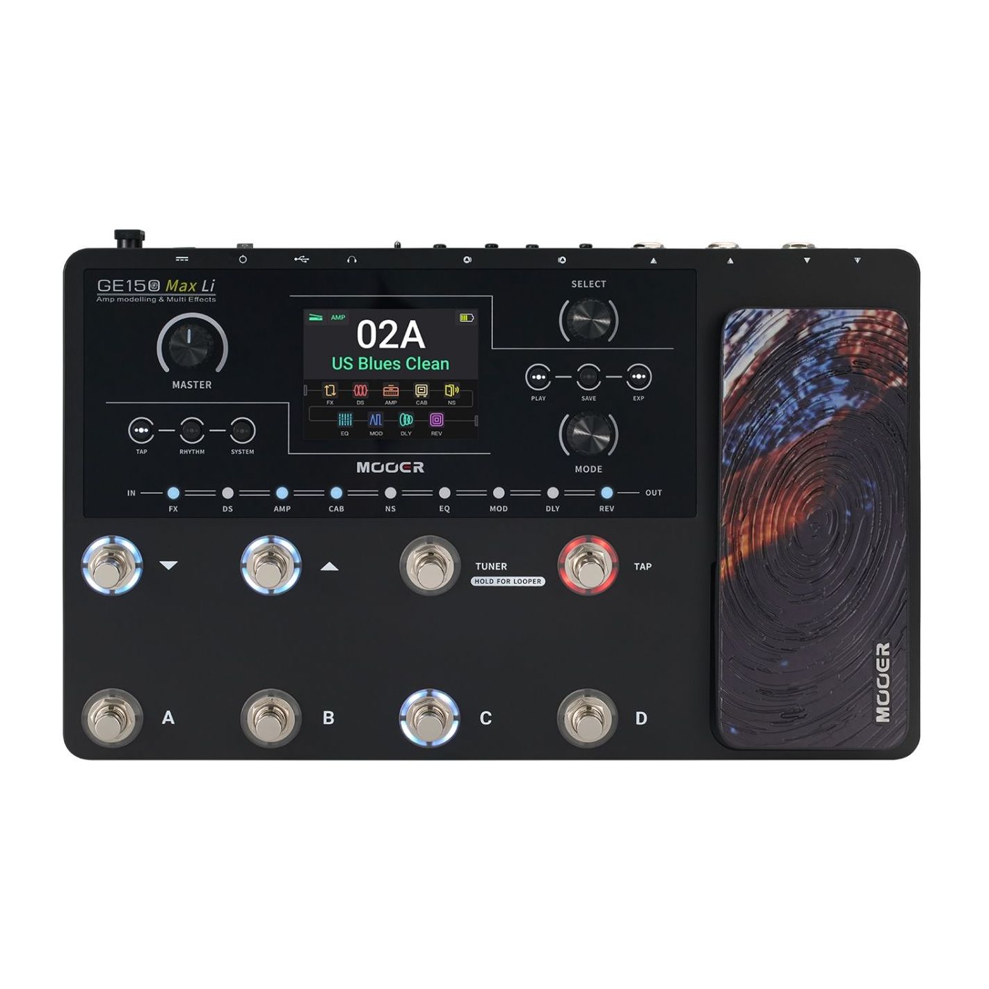Pedalera multiefectos Mooer GE150 Max Li - Versión con batería de litio integrada que permite uso sin conexión a la corriente. Evolución del GE150 con 8 footswitches multifunción, pedal de expresión asignable y modo Ctrl para activar módulos individuales dentro de cada preset. Dispone de 200 presets en 50 bancos, 55 modelos de preamplificadores con tecnología de muestreo no lineal, compatibilidad con archivos Mnrs y carga de IRs de terceros. Incluye looper estéreo de 80 segundos, caja de ritmos con 40 estilos y 10 metrónomos, afinador y pedal dedicado a tap tempo. Función Spillover para
