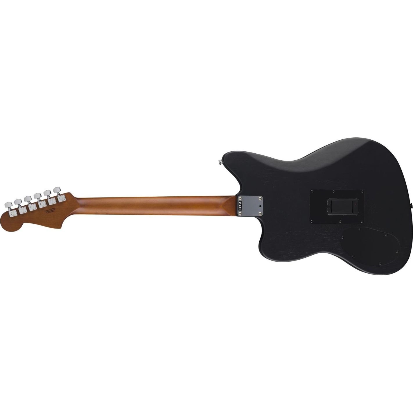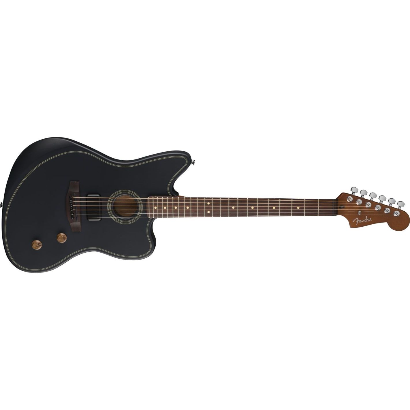 Guitarra acústica-electroacústica Fender Acoustasonic Standard Jazzmaster, Black - Cuerpo de nyatoh con tapa maciza de abeto Sitka. Mástil de nyatoh. 22 trastes. Escala 25.5" (64.77 cm). Diapasón de palisandro. Ancho de cejilla 42.86 mm. Pastillas Acoustasonic Shawbucker magnética y piezoeléctrica Fishman bajo el puente (configuración de 2 pastillas). Controles de volumen maestro y mezcla. Puente moderno asimétrico. Acabado del hardware cromado.