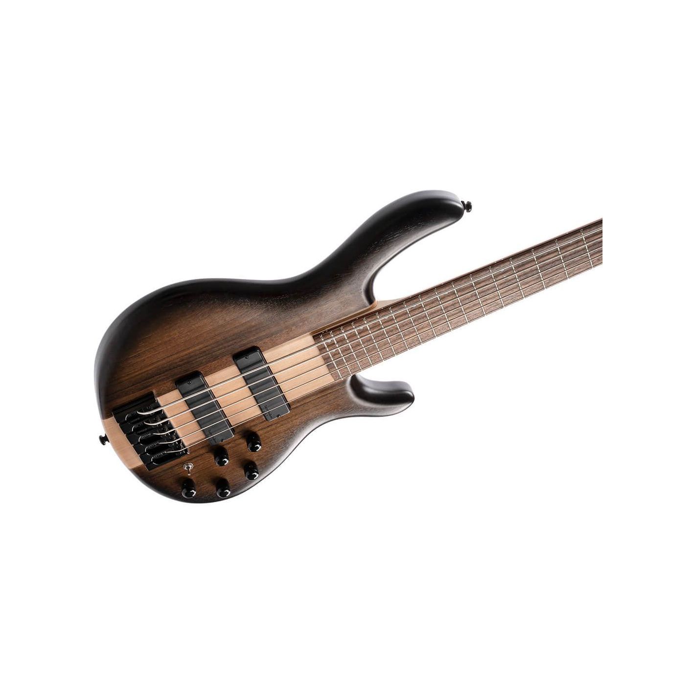 Bajo eléctrico Cort C5 Plus OVMH ABB - Construcción bolt-on, cuerpo de arce y caoba con tapa de ovangkol, escala de 34" (864 mm). Mástil de arce duro con diapasón de jatoba, radio 15.75", 24 trastes. Pastillas Bartolini MK-1 con electrónica Markbass MB-1. Puente Cort EB12(5) y clavijeros die-cast. Acabado Antique Brown Burst, herrajes en negro, cuerdas D’Addario EXL170-5SL.