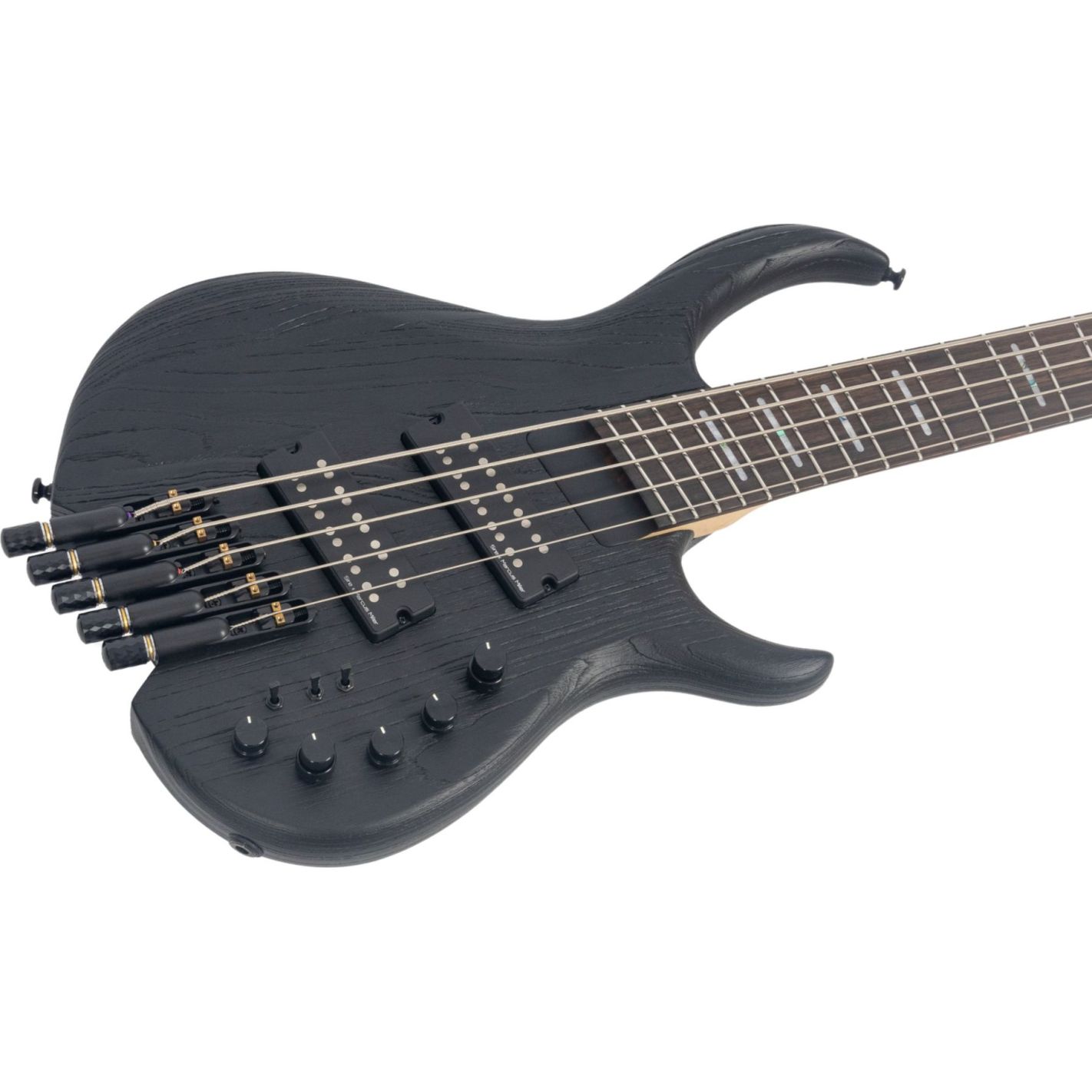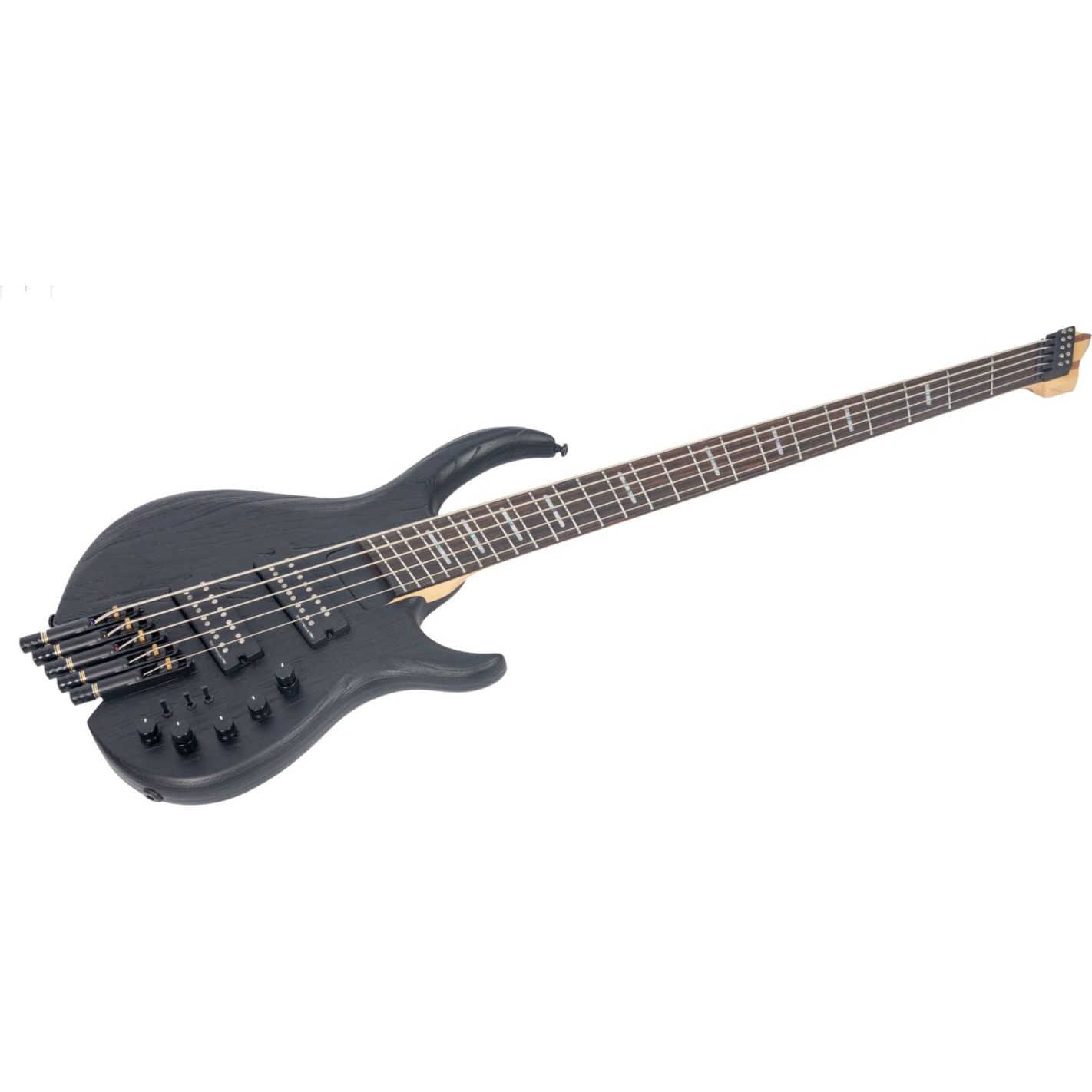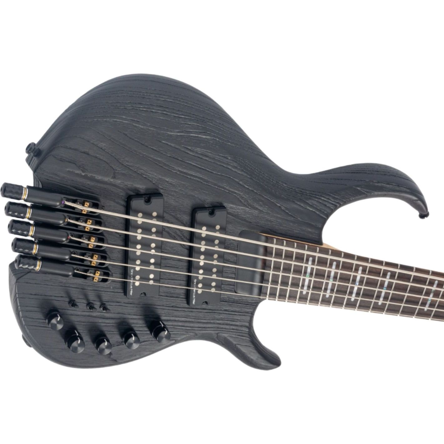 Bajo eléctrico Sire Marcus Miller M6 Headless, Black - Cuerpo de caoba con forma Sire M-Headless y acabado satinado. Mástil de 5 piezas arce/caoba con perfil en “C” y unión atornillada de 5 pernos. Escala multiescala de 33" a 35", diapasón Rosewood Edgeless (bordes redondeados) con radio de 16", incrustaciones de bloques redondeados en pearloid blanco y abulón, 24 trastes medium jumbo de acero inoxidable, cejuela Graphtech Tusq XL de 45,7 mm. Pastillas Marcus Pure-H Revolution Set, previo activo Marcus Heritage-3 con control de frecuencia media. Controles Volume/Tone, Blender, Treble, Middle/Freq, Bass, selector Pickup Variation. Puente individual Sire Headless, acabado del hardware en negro. Incluye cuerdas DR Dragon Skin+DBQ5-45 y funda oficial Sire.