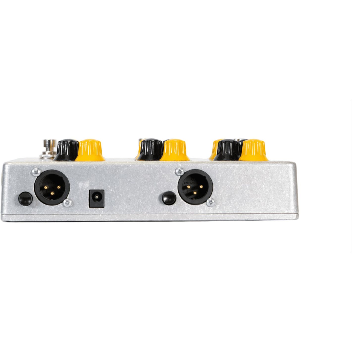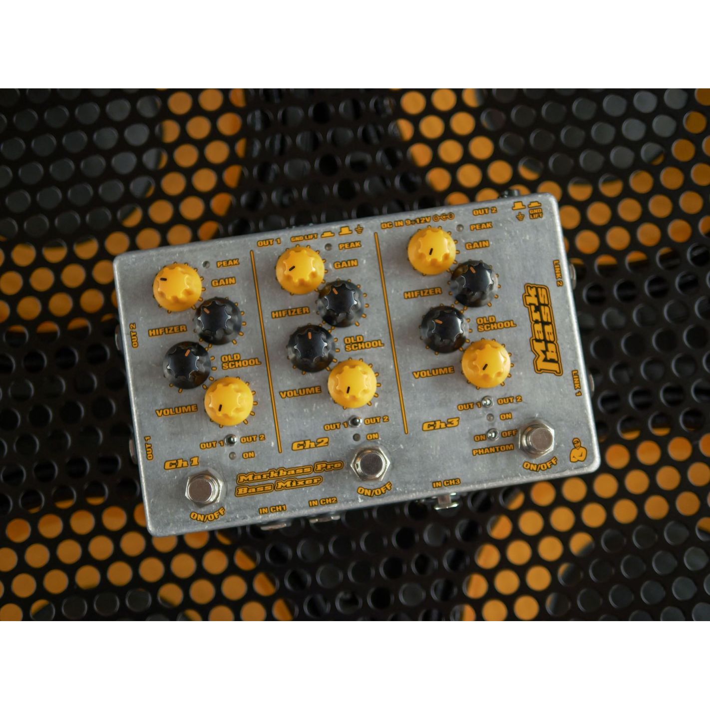 Mezclador para bajo Markbass MB Pro Bass Mixer - Mezclador de 3 canales en formato pedal compacto. Entradas: 2 jacks de 6,35 mm (impedancia 1 MΩ), 1 combo jack/XLR (impedancia 22 kΩ / 2 kΩ) con alimentación phantom +48V. Entradas Link 1 y 2 para conexión de otro Pro Bass Mixer. Controles por canal: Gain, Volumen, Hifizer (Pre Shape 700 Hz, de 0 a 25 dB) y Old School (filtro paso bajo de 450 Hz a 20 kHz). Selector de enrutamiento de salida 1 o 2 por canal. Salidas: 2 jacks de 6,35 mm y 2 XLR balanceados con interruptor Ground Lift. Alimentación 9-12 VDC, 120 mA, incluye adaptador de red.