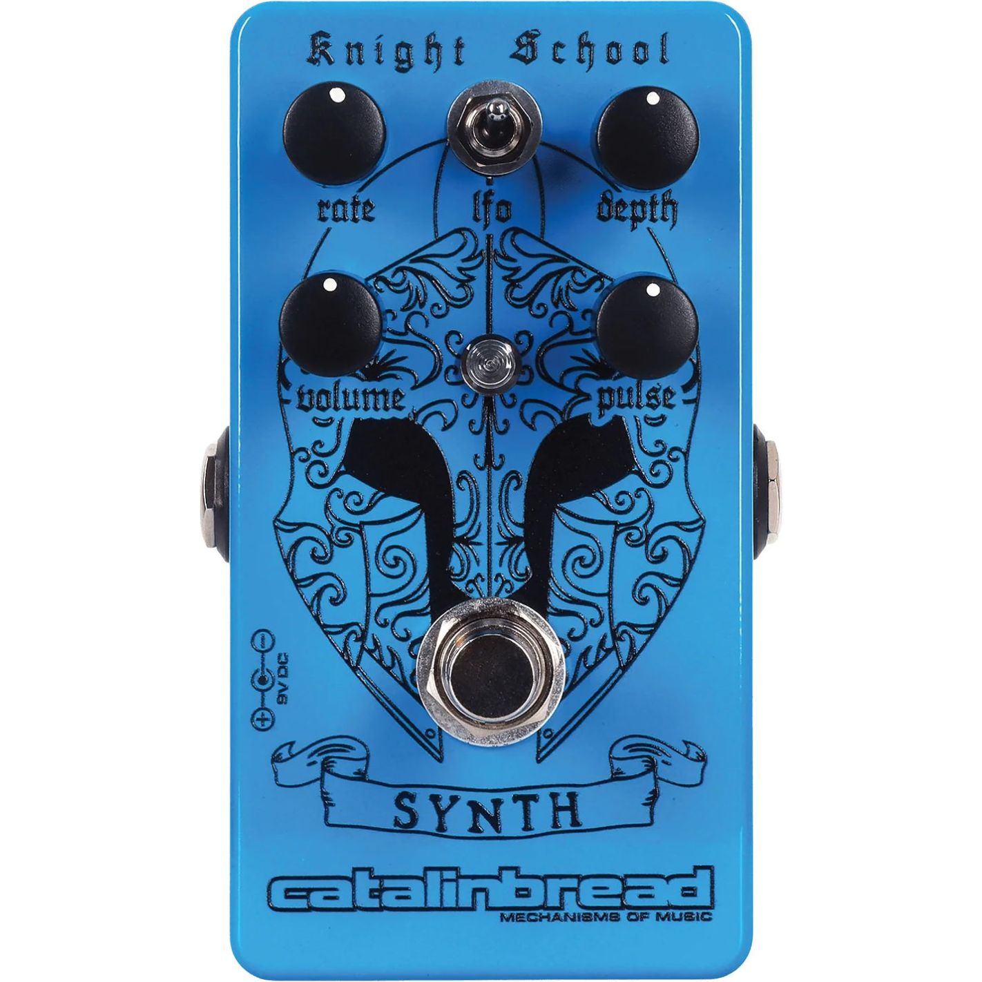 Pedal sintetizador Catalinbread Knight School Synth - DIY Kit - Kit de montaje que convierte la señal de guitarra en una onda cuadrada controlada por el chip CD40106, emulando el sonido de los sintetizadores monofónicos clásicos. Incluye un LFO conmutable que modula automáticamente el ancho de pulso, con controles Rate, Depth, Pulse y Volume para ajustar velocidad, intensidad, forma y nivel de salida. Capaz de generar desde texturas pulsantes y rítmicas hasta sonidos sintéticos extremos. Alimentación de 9 V DC (centro negativo).