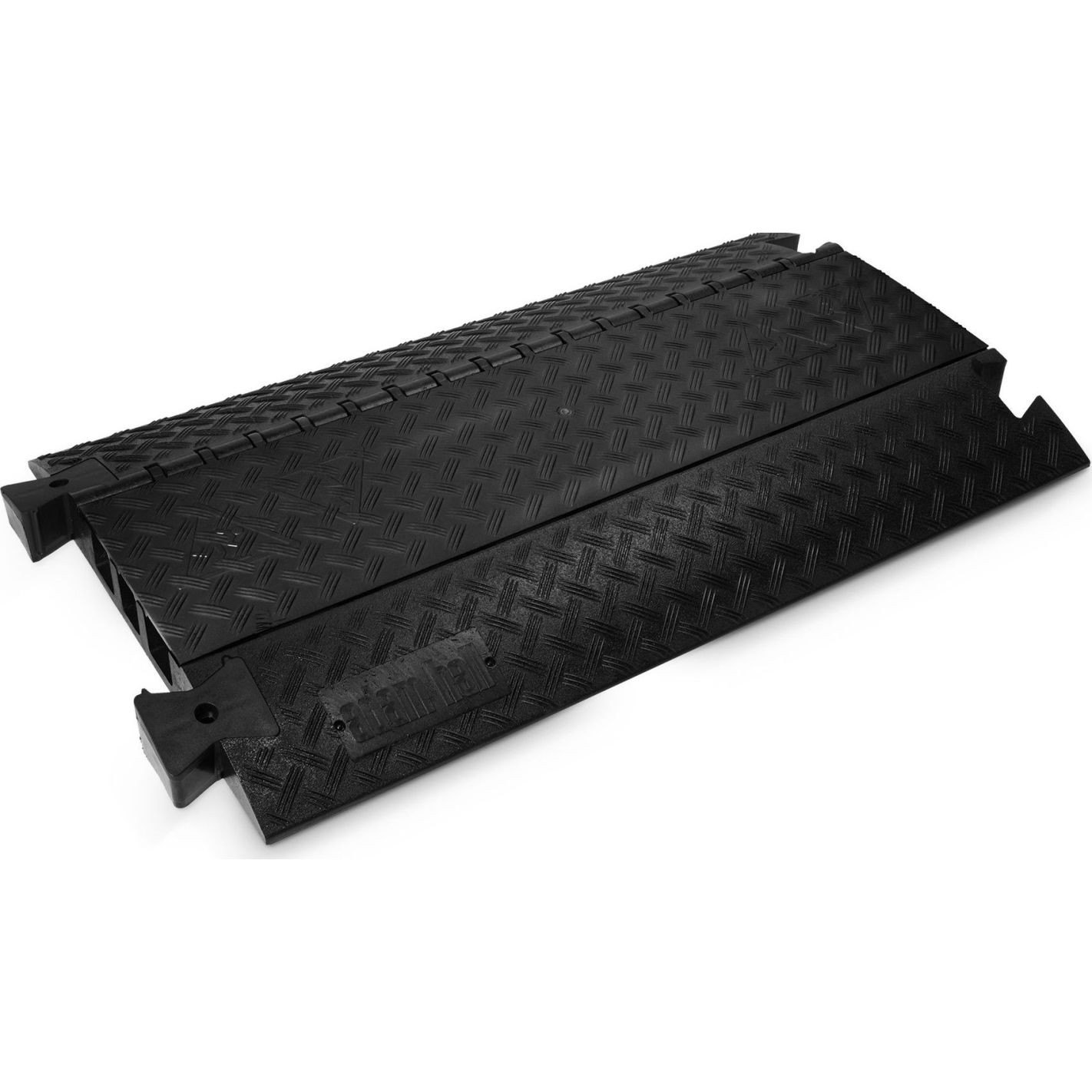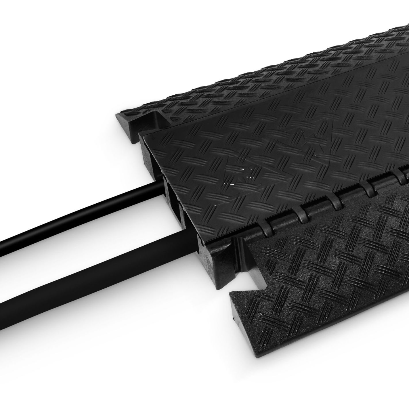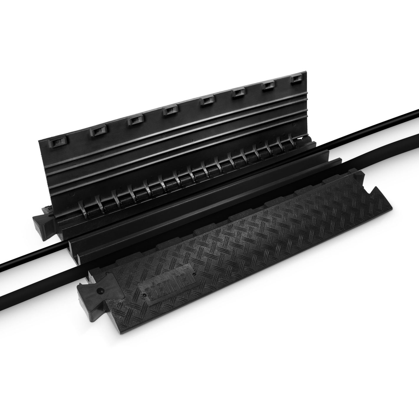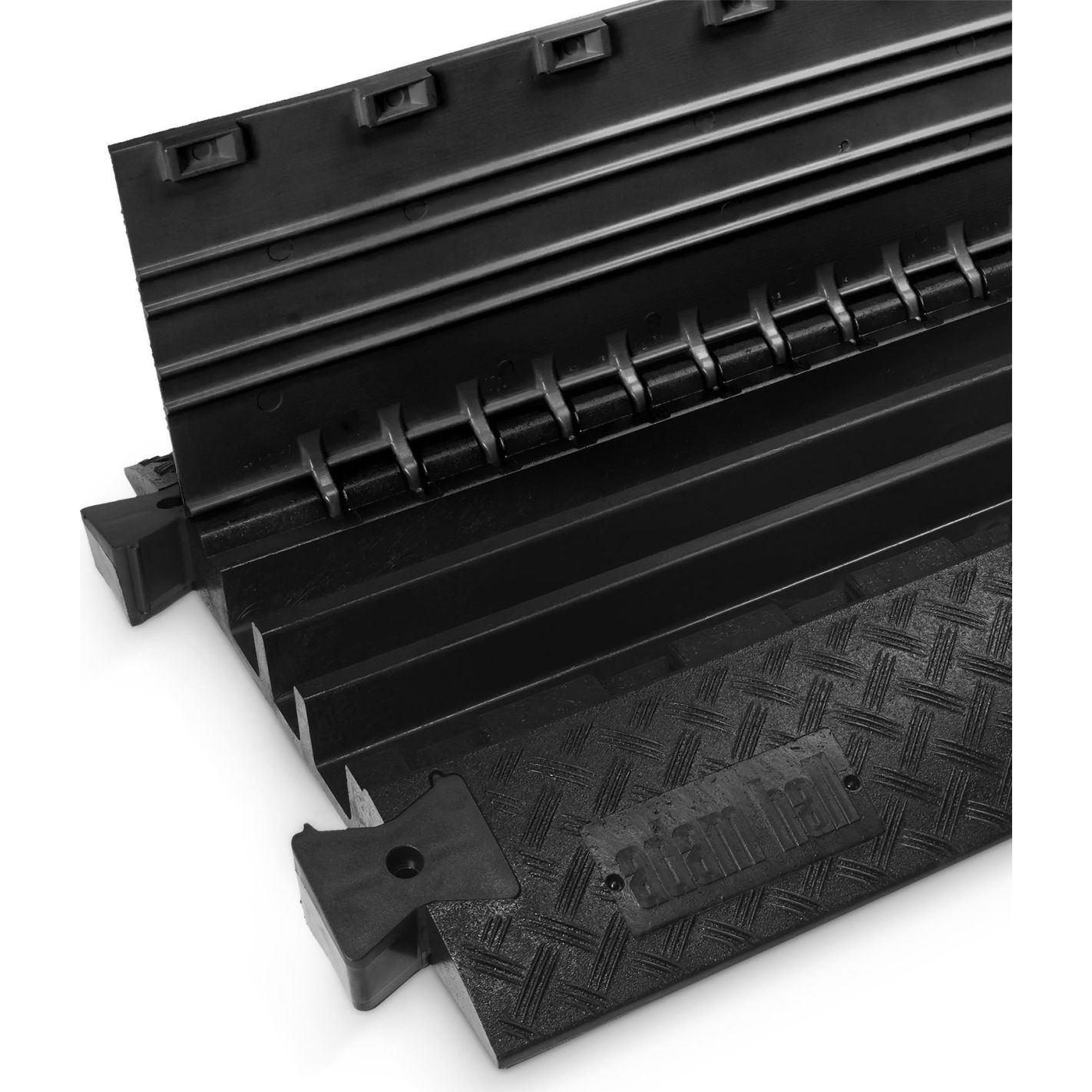 Protector de cable, Defender, 3 BLK - Pasacables de 3 canales en poliuretano reciclable negro, resistente y antideslizante, con asas integradas. Tapa de poliuretano con bisagra autolimpiable y cierre seguro. Canales: 1 de 45 x 50 mm y 2 de 52 x 49 mm. Capacidad de carga aprox. 5 t/25 x 30 cm. Resistencia al fuego B2 (DIN 4102) y certificado TÜV SÜD. Resistente al petróleo, ácido, gasolina y disolventes. Dimensiones 105 x 60,7 x 7,3 cm; peso 23,5 kg. Apto para interior y exterior, con accesorios opcionales de curvas, rampas y uniones.