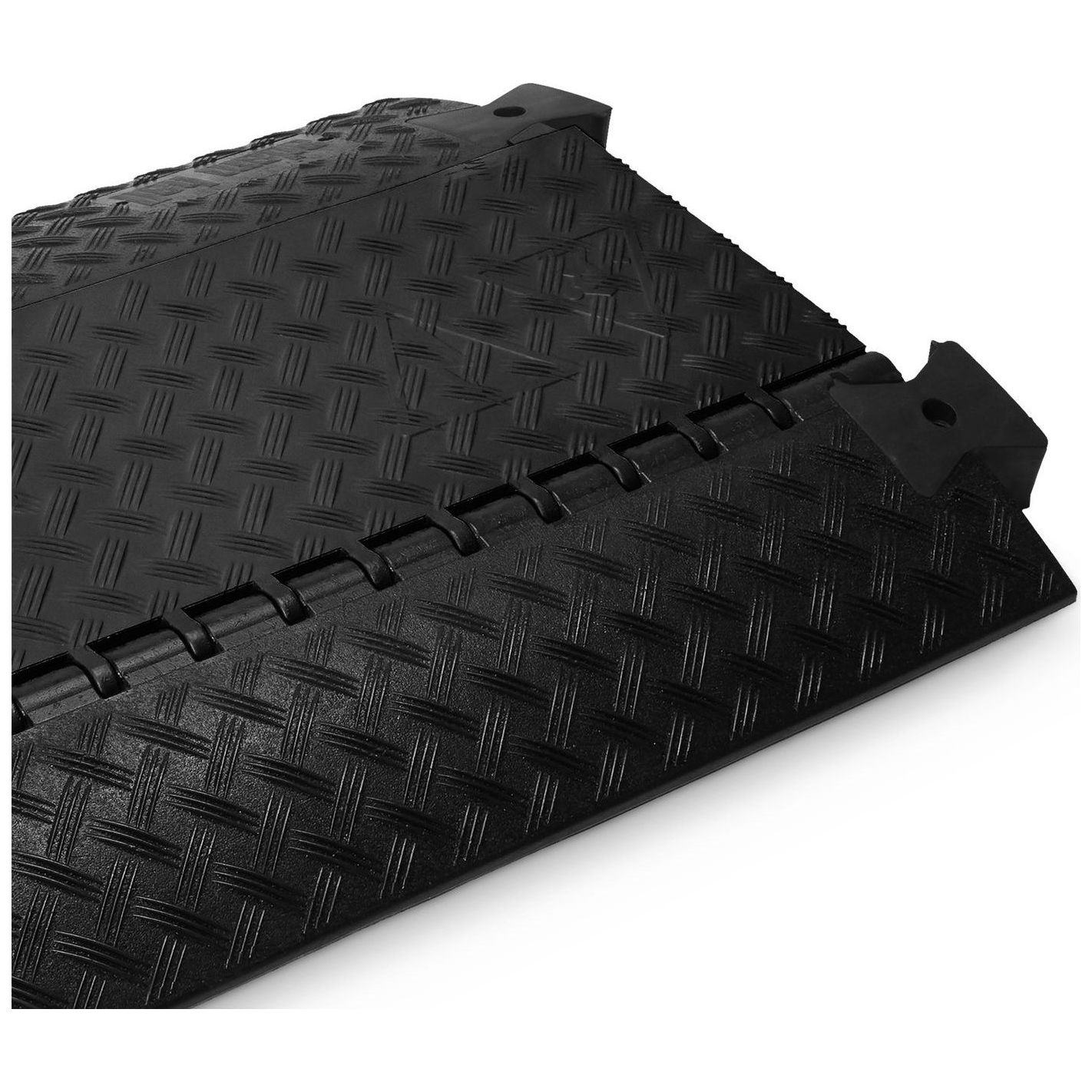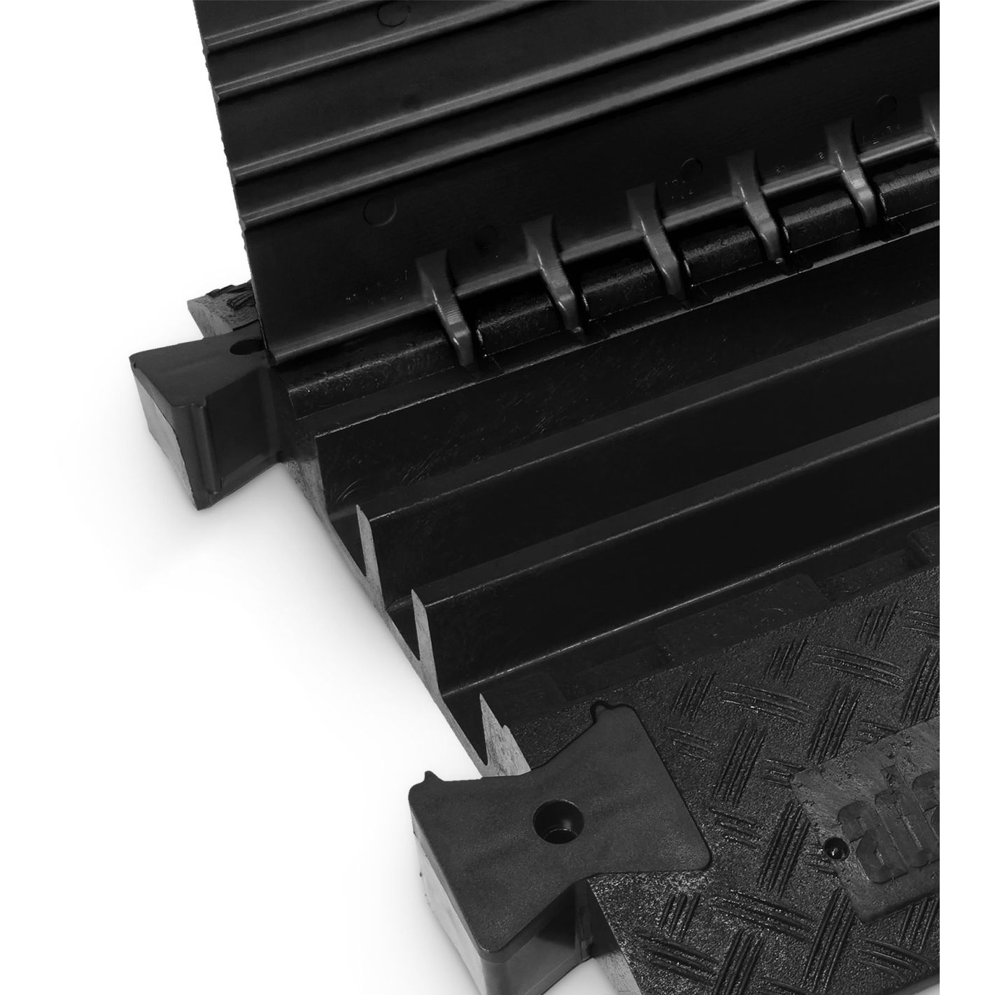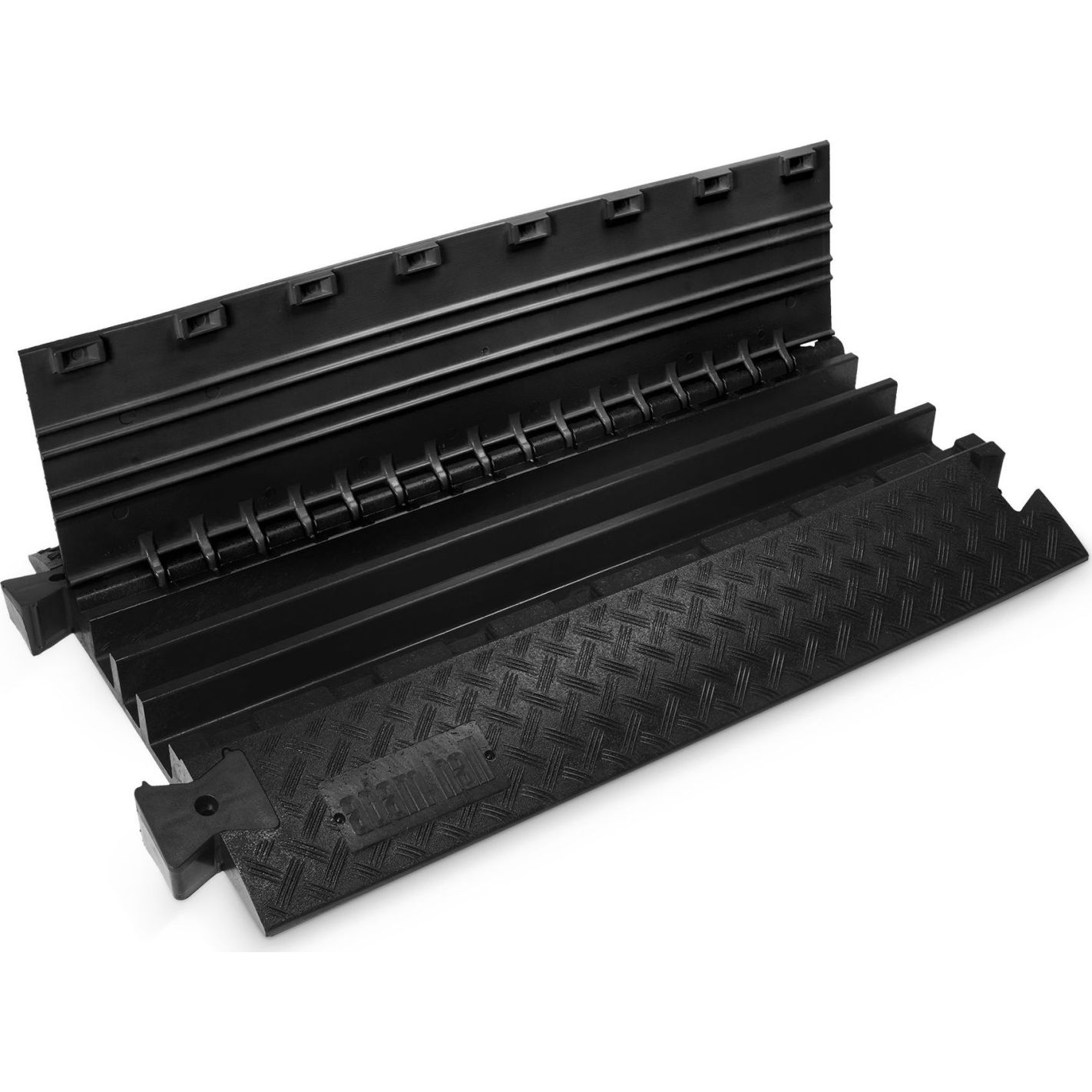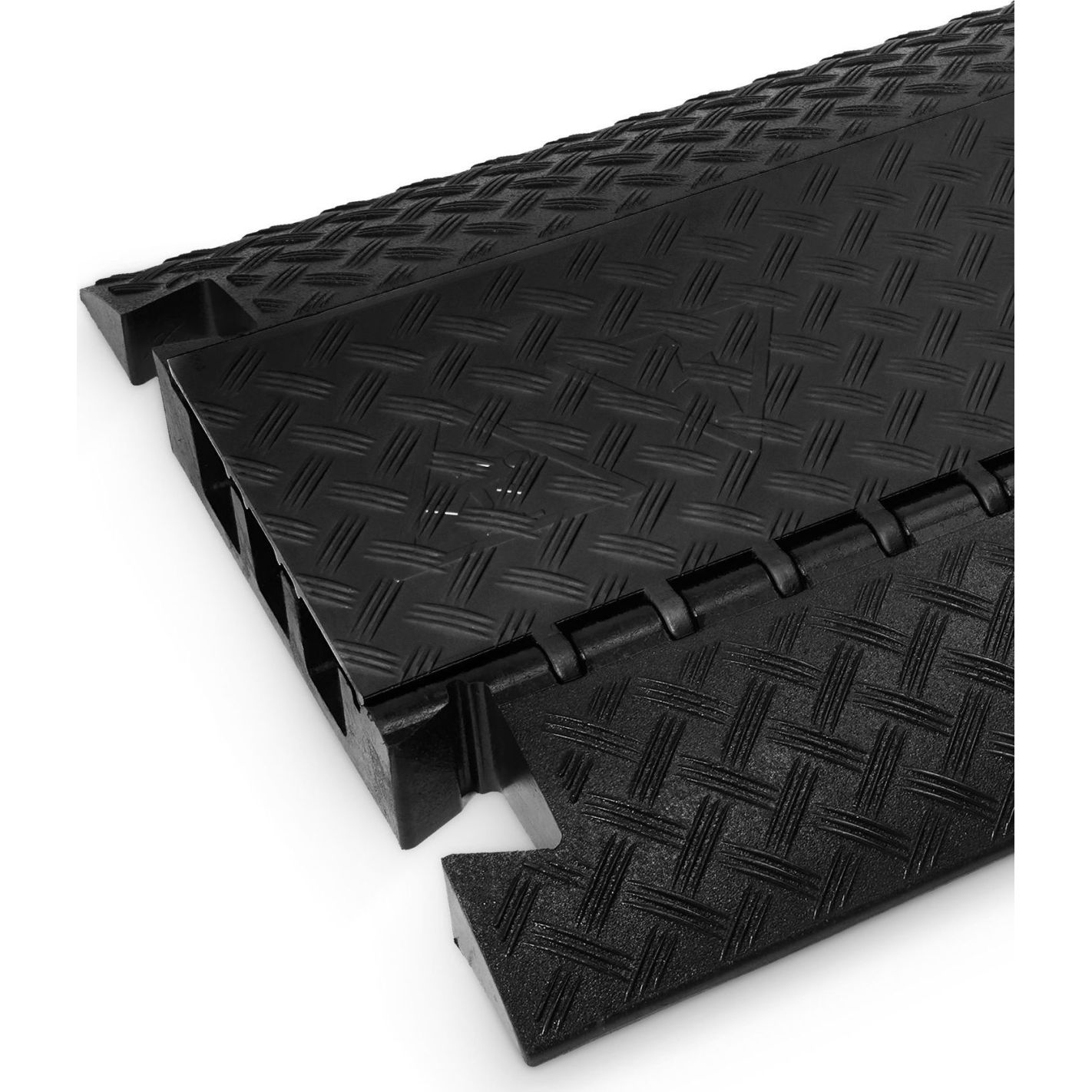 Protector de cable, Defender, 3 BLK - Pasacables de 3 canales en poliuretano reciclable negro, resistente y antideslizante, con asas integradas. Tapa de poliuretano con bisagra autolimpiable y cierre seguro. Canales: 1 de 45 x 50 mm y 2 de 52 x 49 mm. Capacidad de carga aprox. 5 t/25 x 30 cm. Resistencia al fuego B2 (DIN 4102) y certificado TÜV SÜD. Resistente al petróleo, ácido, gasolina y disolventes. Dimensiones 105 x 60,7 x 7,3 cm; peso 23,5 kg. Apto para interior y exterior, con accesorios opcionales de curvas, rampas y uniones.