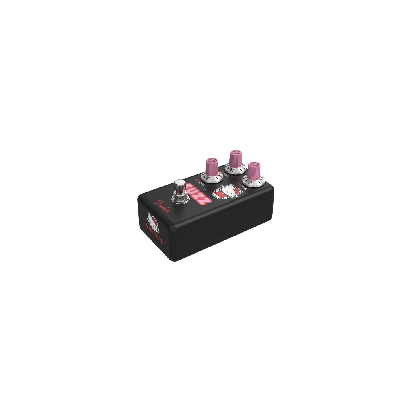 Pedal de efectos Fender Hello Kitty Fuzz Black - Pedal fuzz basado en circuito de amplificador operacional, con controles de volumen, tono y fuzz. Ofrece una amplia gama de tonos que van desde una distorsión estilo overdrive hasta fuzz agresivo y saturado, compatible con buffers. Diseño exclusivo en acabado negro con perillas tipo "witch hat" en rosa, etiquetas en japonés y gráfica de Hello Kitty en el panel frontal. Carcasa de aluminio resistente con conectores jack superiores. Funciona con pila de 9V o adaptador de corriente de 9V DC, polaridad negativa (no incluido). Impedancia de entrada