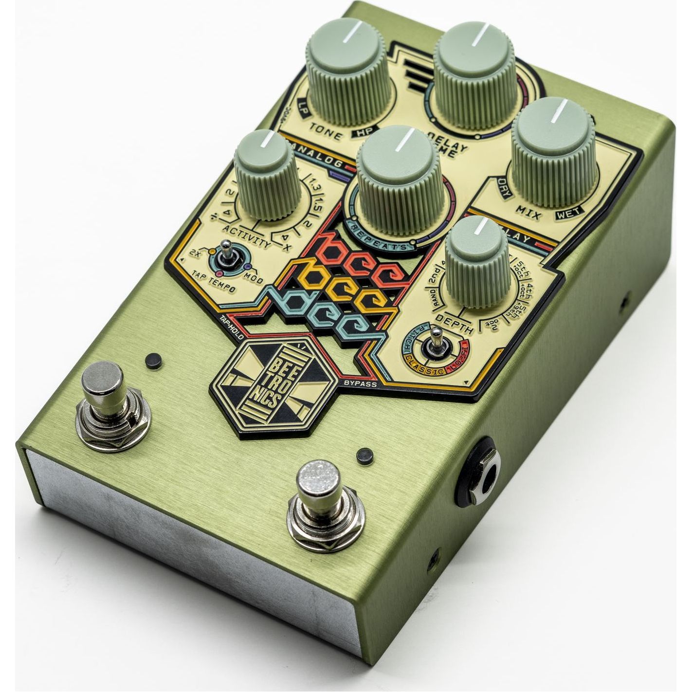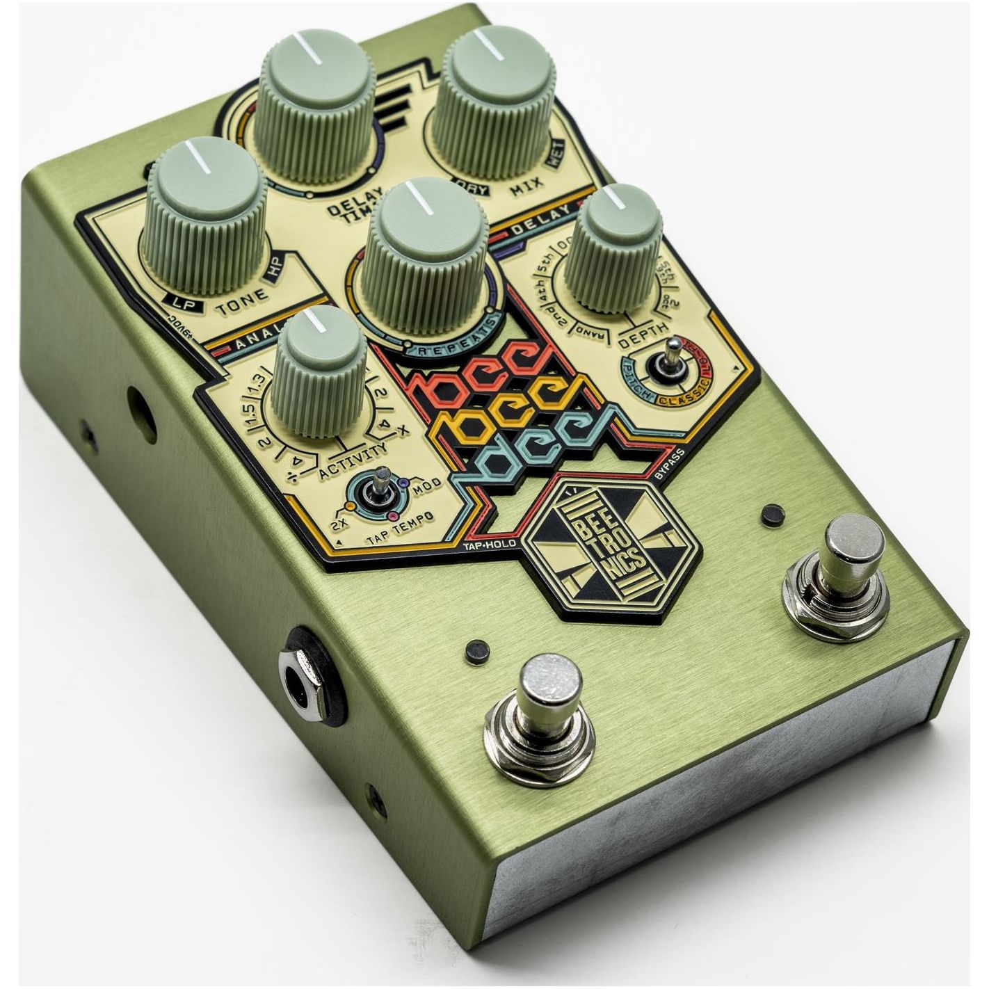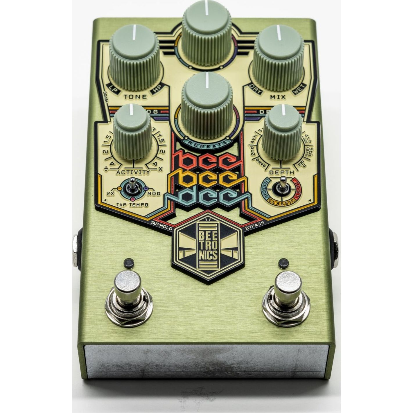 Pedal de delay Beetronics Bee Bee Dee - Primer delay de la marca, basado en tecnología BBD (Bucket-Brigade-Device) con control digital e íntegro recorrido de audio analógico. Ofrece 3 modos: Classic (tono BBD con modulación senoidal suave), Lo-Fi (repeticiones oscuras y granuladas con variaciones irregulares de tono y tiempo), y Pitch (ecos con cambios de afinación que generan armonías y texturas rítmicas). Funciones de rendimiento: Tap tempo, 2X (divide el tiempo y transpone una octava) y Mod (activa o inyecta modulación). Controles: Tone, Delay Time, Mix, Activity, Depth; miniconmutadores de