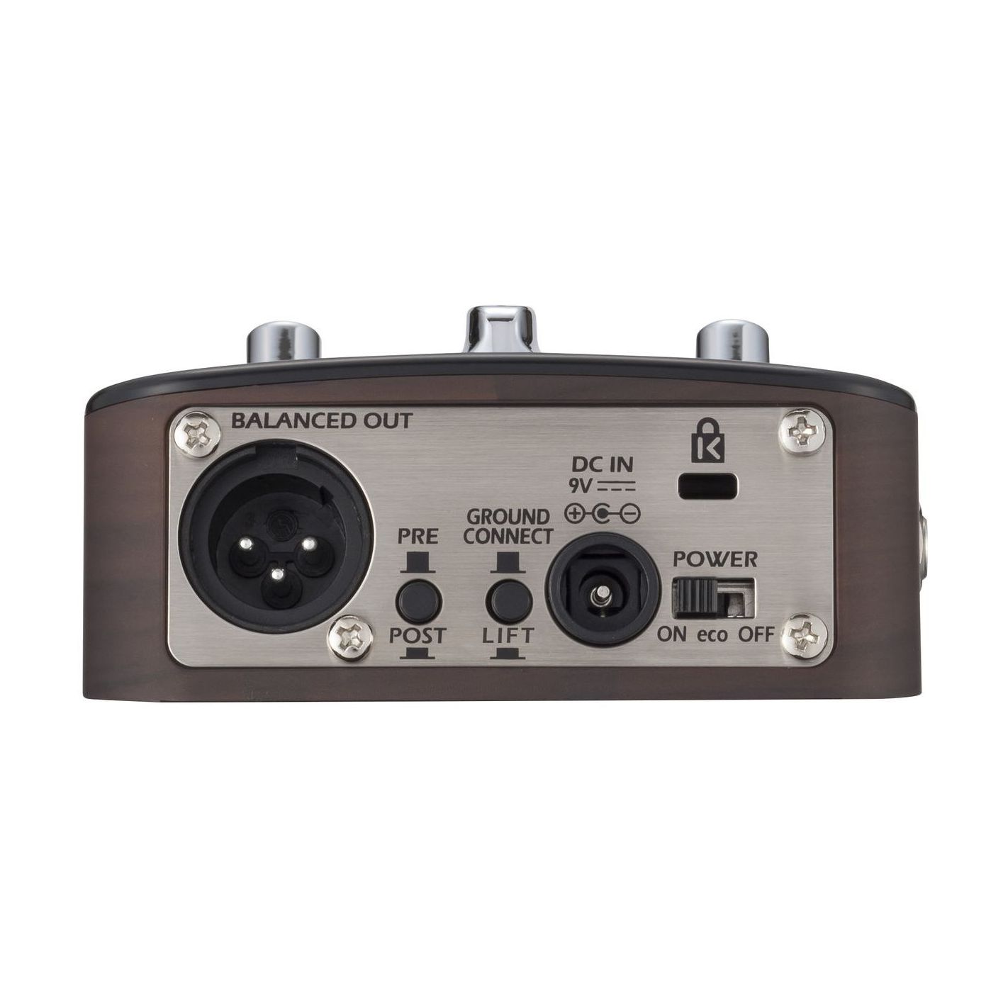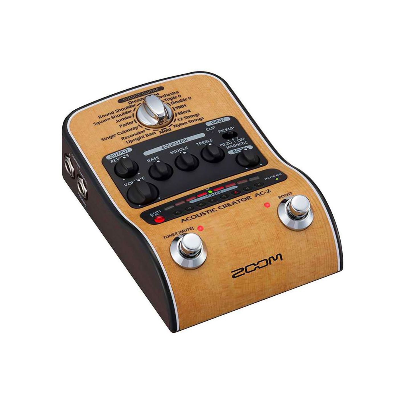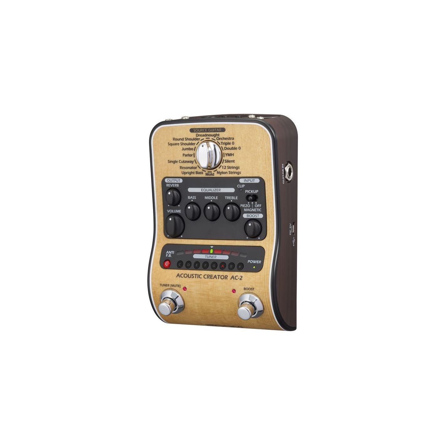 Pedal de efectos AC-2 Acoustic Creator - 16 presets tipo/caja de fuente de guitarra para una reproducción de tono precisa Interfaz de fácil uso para músicos con acceso instantáneo a todos los controles en el panel frontal Entrada de 1/4 Salida XLR balanceada. Dos salidas de 1/4 para conexión mono o estéreo a amplis de guitarra, auriculares o interfaces de audio. Efecto de Reverb Previo de alta calidad con bajo ruido. Selección de pastilla Piezo/magnética. Ecualizador de 3 bandas. Ganancia/sensibilidad de entrada y salida ajustable mediante un único knob de volumen (pendiente de patente). Control anti-feedback Interruptor Boost para una ganancia adicional de hasta 9 dB. Afinador cromático incorporado con LEDs. Puerto USB para actualizaciones del firmware. Adaptador AC incluido