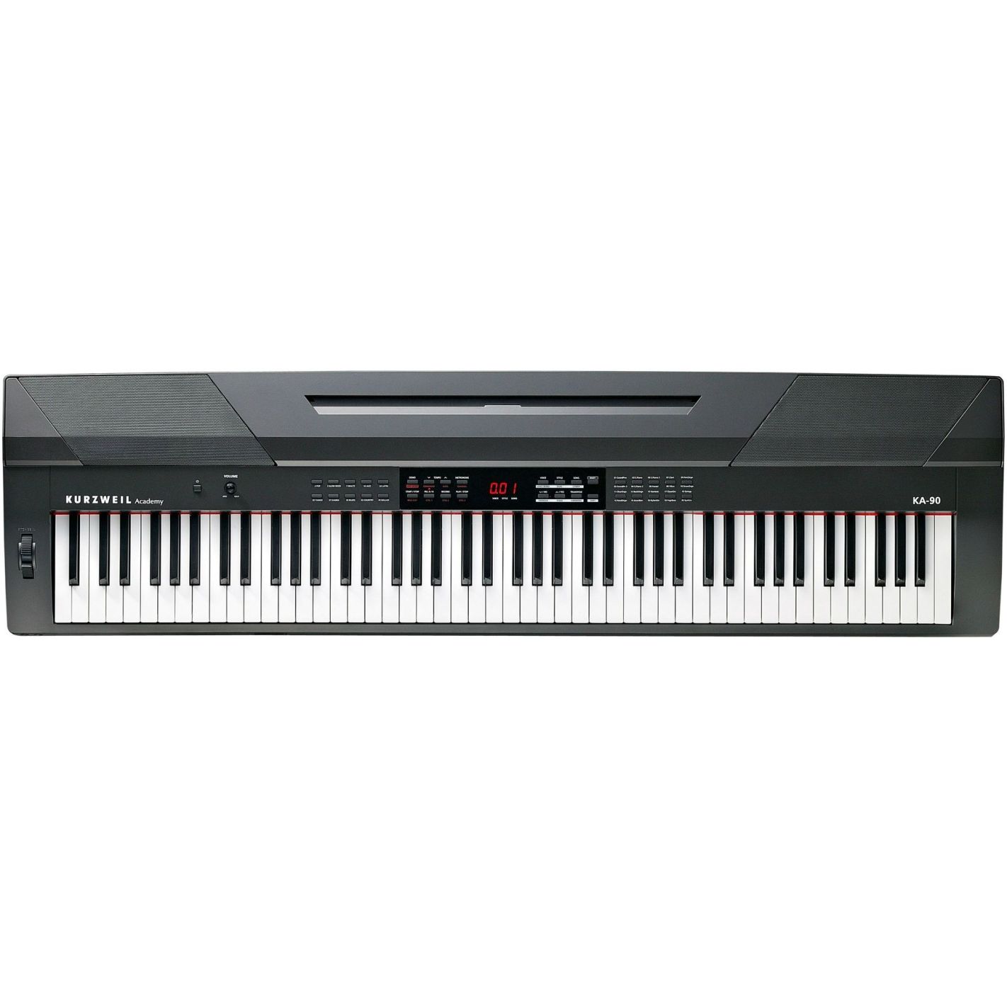 KA90 - PIANO DIGITAL DE 88 TECLAS CON ACOMPAÑAMIENTOS KURZWEIL COLOR NEGRO - Teclado: 88 notas completamente contrapesadas, acción de martillo con teclas sensibles al tacto ajustables. Sensibilidad del teclado: 4 niveles de respuesta seleccionables. Pantalla: LED de 3 caracteres. Polifonía: 128 voces. Programas preestablecidos: 20 sonidos expresivos. MIDI generales: No. Divisiones/Capas: Sí. Transposición: transposición completa a cualquier tecla, +/- una octava. Melodía: ajuste por centavos (+/- 100 centavos). Efectos: Reverb / Chorus / EQ (5 selecciones preestablecidas por efecto). Estilos