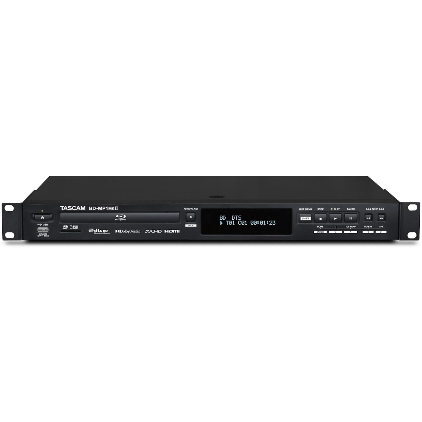 Reproductor Blu-Ray profesional TASCAM BD-MP1MK2 - Reproductor de Blu-ray, DVD, CD y estado sólido de un solo espacio de rack. Control mediante red Ethernet (Telnet), RS-232C o mando a distancia inalámbrico. Compatible con BD25, BD50, BD-ROM, BD-R, BD-RE, DVD, DVD+R, DVD-R, DVD+RW, DVD-RW, CD, CD-R, CD-RW, tarjetas SD (hasta 512 GB) y USB. Conversión NTSC/PAL, función BD-Live. Salida HDMI HD A/V compatible con HDMI CEC. Salidas independientes de sonido envolvente 7.1, salidas estéreo XLR balanceadas y RCA no balanceadas, atenuación de hasta 40 dB en salidas estéreo analógicas y digitales. Salida de audio digital coaxial (SPDIF, Dolby, DTS). Funciones de reproducción de encendido, reanudación, repetición, reproducción instantánea y bloqueo. Información en pantalla activable, regulable. Actualización de firmware por disco o USB. Mando a distancia IR incluido.