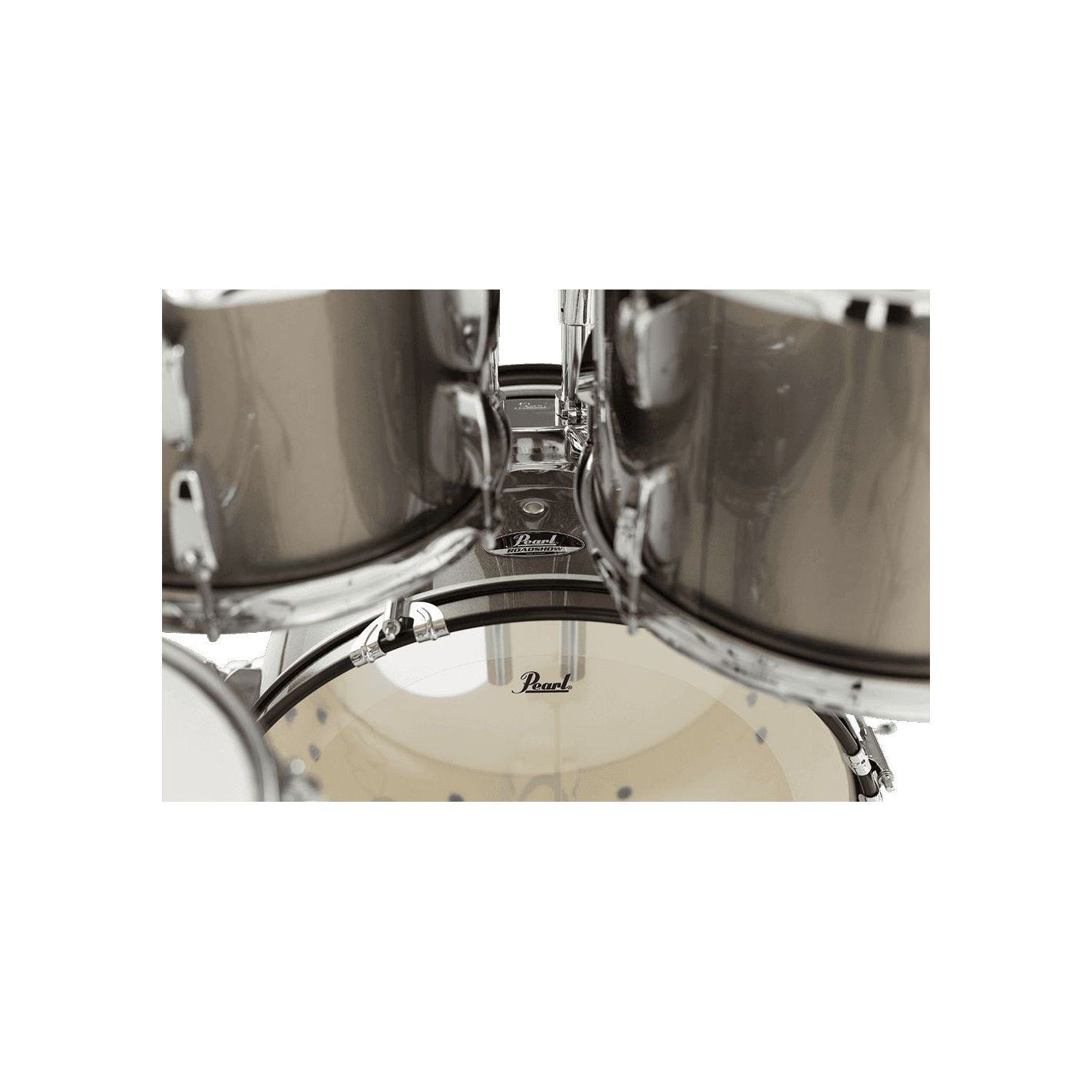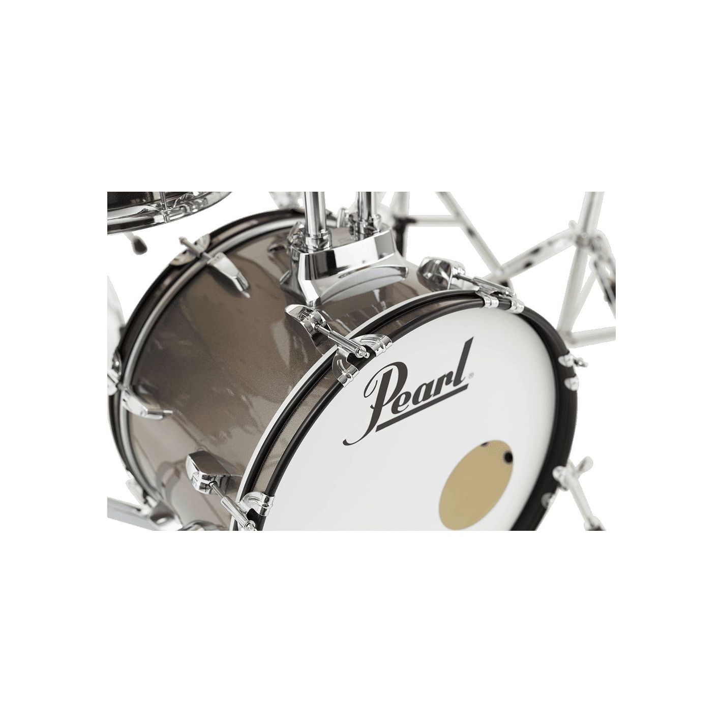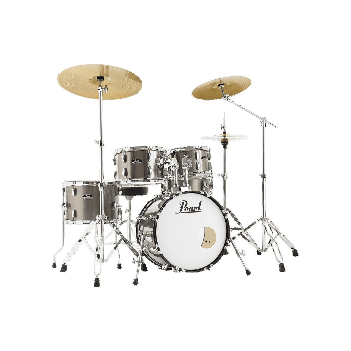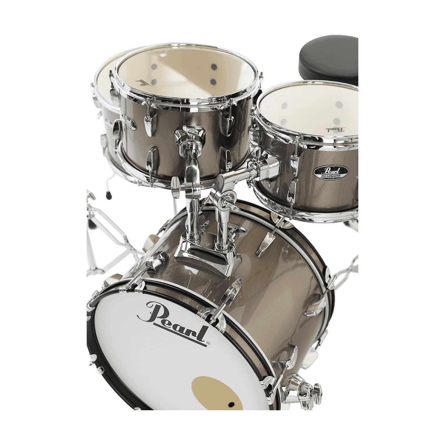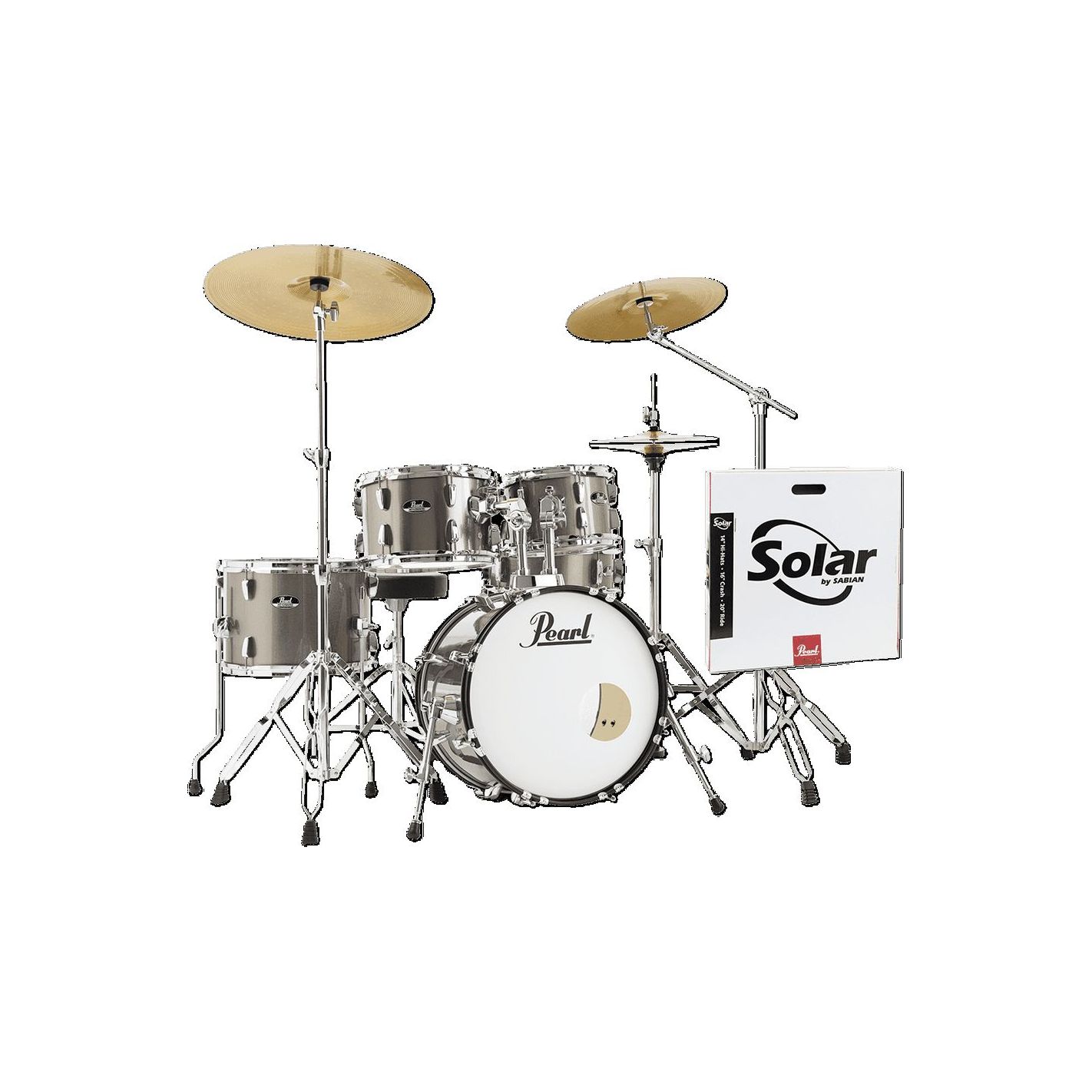 Kit batería Pearl Roadshow, modelo PPARSS585BCC-707 - Configuración: bombo 18"x12", toms 10"x7" y 12"x8", tom base 14"x10", caja 13"x5". Cascos de álamo 6 capas (7 mm) con acabado Rhodoïd. Incluye herrajes de doble perfil, pedal de bombo, sillín, bolsa con baquetas y pack de platos Solar (hi-hat 14", crash 16", ride 20"). Acabado Bronze Metal.