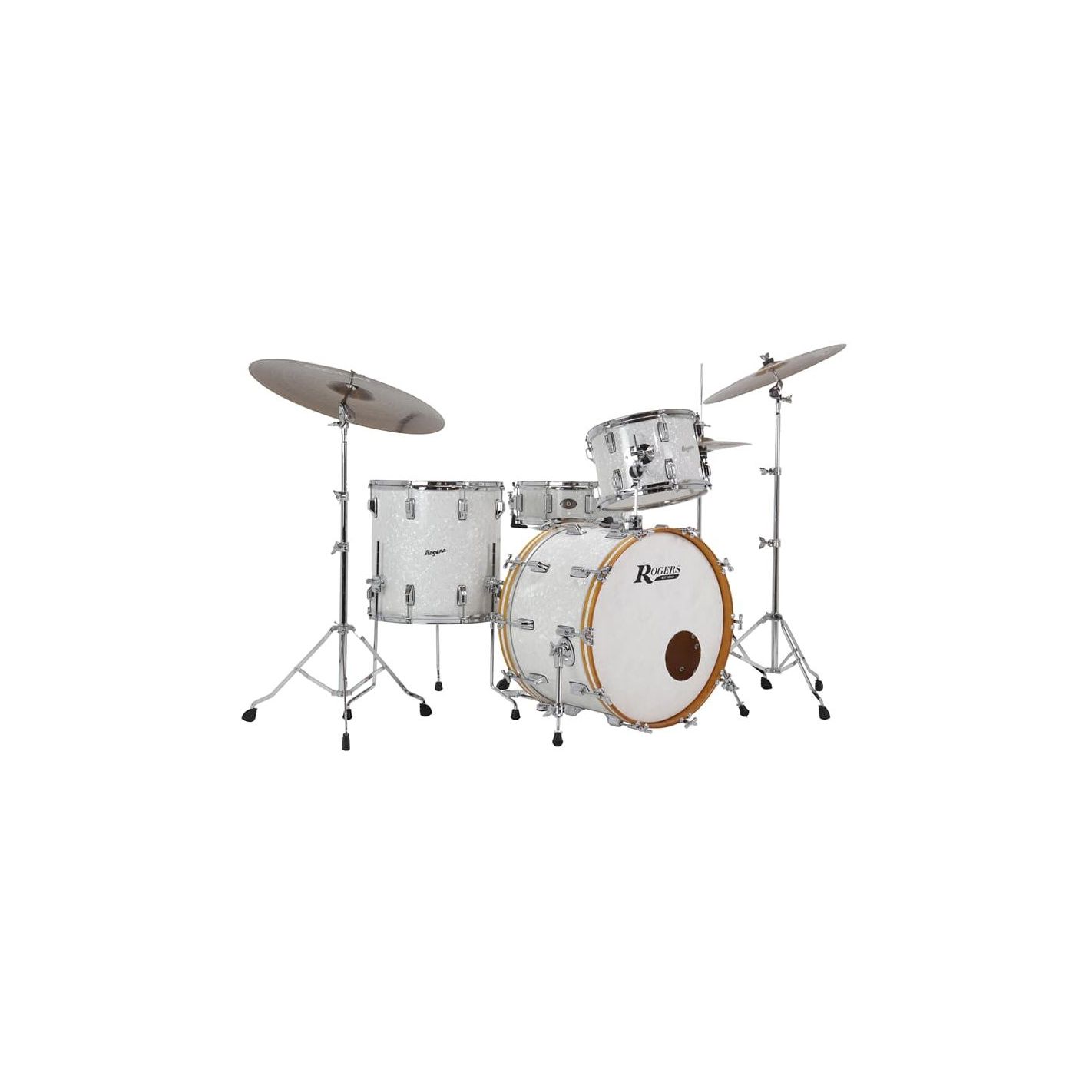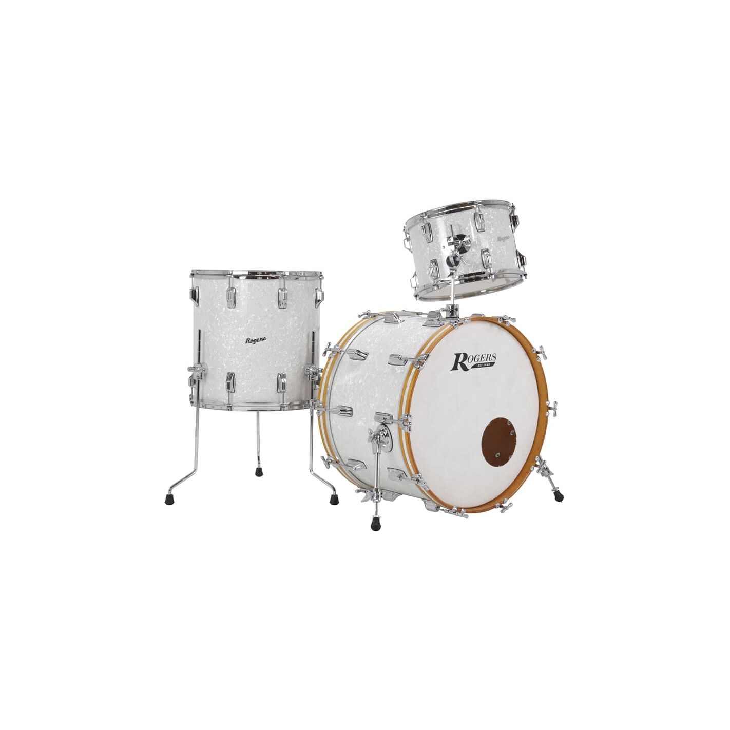 Rogers PT-0322HX-WMP - shell kit Powertone - acabado White Marine Pearl - Bombo 22x14, tom 13x9, base 16x16 - cascos patentados de arce y álamo norteamericano de 5 capas con aros de refuerzo de 2 capas de arce - acabado cubierto - acabado interno "Fruitwood stain" - aros Triple Flanged de 2,3mm - herrajes cromados - soporte de tom a bombo sencillo con Ultra-Matic Hex Mounting System - tensores Beavertail - tornillos de tensión del bombo Bow-Tie - Badge Rogers "script logo"
