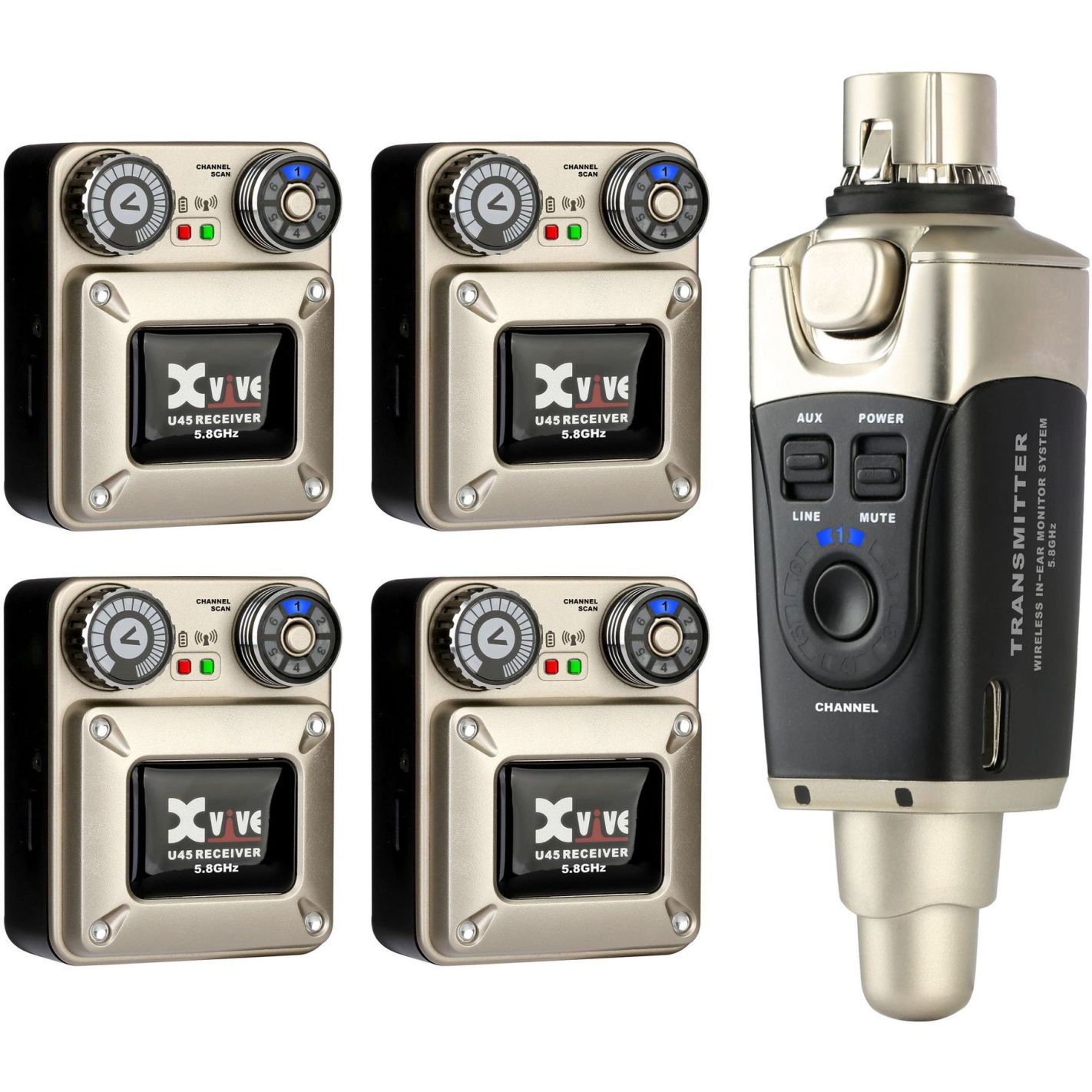 Xvive U45R4 - Monitor In-ear / Personal Conjunto de monitorización intraauricular inalámbrica U45r4 compuesto por un transmisor y cuatro receptores. Ligero y compacto. Emisor y receptor recargables que funcionan en la banda de frecuencias de 5,8 GHz. Interruptor Aux/Line. Salida minijack estéreo. Conversión A/d de 24 bits/48 kHz, transmisión digital sin comprimir. 6 canales. Alcance de hasta 30 m (sin obstáculos). Respuesta en frecuencia: de 20 Hz a 20 kHz. Latencia inferior a 5 ms. Rango dinámico 110 dB. Relación señal/ruido 110 dB. Alrededor de 5 horas de autonomía. Cable Usb incluido. Robustas carcasas de Abs. Entregado con adaptador Xlr macho a jack mono de 6,35 mm y tapa. Peso: 90 g (transmisor) y 118 g (receptor). Acabado: Plata.