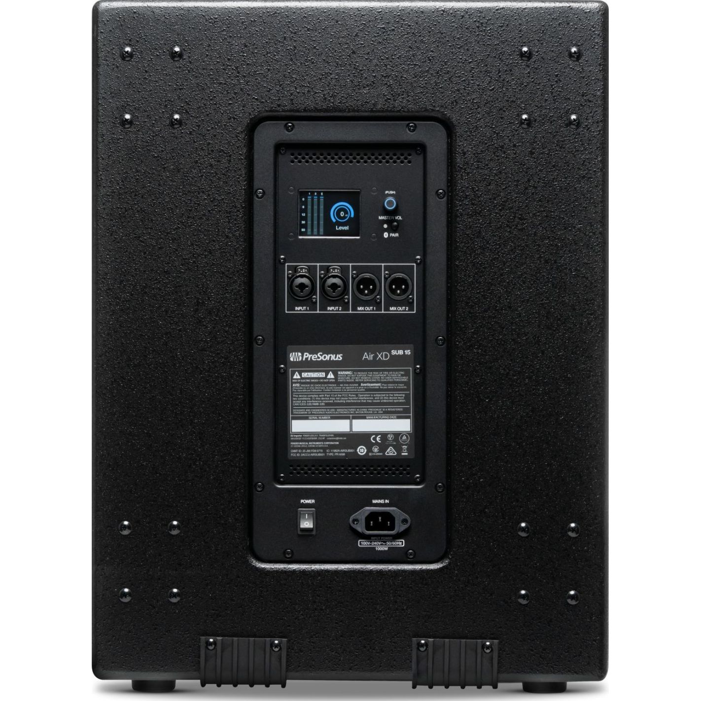 Subwoofer activo PreSonus AIR XD Sub 15 - Subgrave profesional con woofer personalizado de 15” y bobina de 3” para graves profundos y dinámicos con mínima distorsión. Amplificación Clase D de 2000 W que alcanza hasta 128 dB SPL. Respuesta de frecuencia: 39 Hz–95 Hz (-3 dB), 32 Hz–131 Hz (-10 dB). DSP avanzado con filtro paso bajo variable, delay de alineación y presets de array cardioide/end-fire, además de refuerzo “Mo’ Bass” para mayor pegada en graves. Pantalla LCD a color de 2,6” para control y monitoreo. Bluetooth con modo TWS Bridge para emparejamiento estéreo inalámbrico con cajas AIR XD full-range. Entradas combo con salidas directas para integración flexible. Recinto de madera robusto con asas ergonómicas, provisión para apilado en suelo y soportes para ruedas incorporadas.