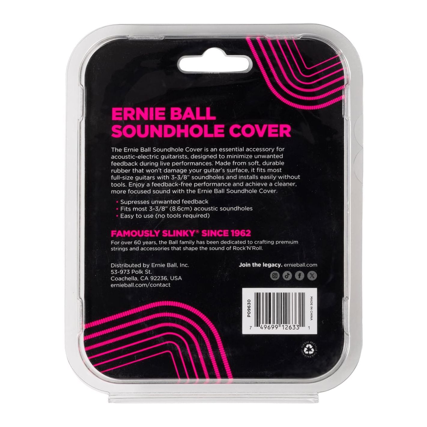 Tapa anti-feedback, Ernie Ball AEB9630 - Diseñada para guitarras acústicas de tamaño completo con boca de 8,6 cm (3-3/8"). Fabricada en goma duradera y suave que no daña el instrumento. Reduce retroalimentación y ruidos no deseados, protegiendo además contra polvo y suciedad. Instalación rápida y sin herramientas.