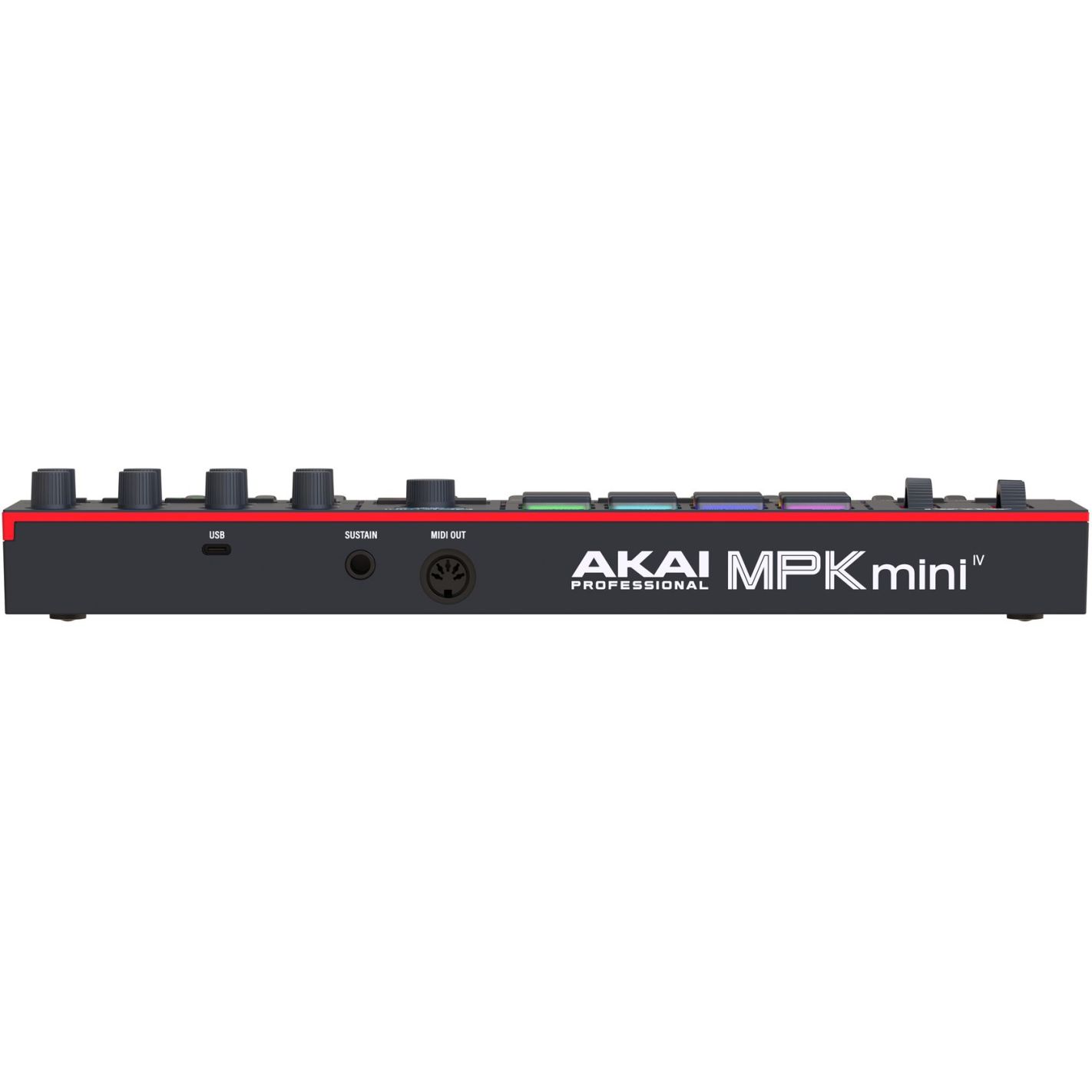 Teclado controlador Midi Akai MPK Mini IV, Black - Controlador portátil de 25 teclas sensibles a la velocidad con teclado de tercera generación, ruedas reales de pitch y modulación, y 8 pads MPC RGB retroiluminados sensibles a la presión (2 bancos). Incorpora pantalla a todo color, 8 perillas asignables de 360°, y sección de transporte ampliada para control directo de DAW. Incluye arpegiador avanzado con funciones Patrón, Congelar y Mutar, modos Escala y Acorde, y salida MIDI de 5 pines. Conectividad USB-C y entrada TS de 6.3mm para pedal de sustain. Alimentación por bus USB. Dimensiones: 347.5 × 45.7 × 192 mm. Peso: 1.05 kg.